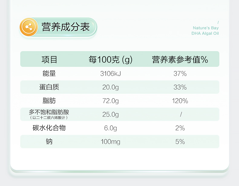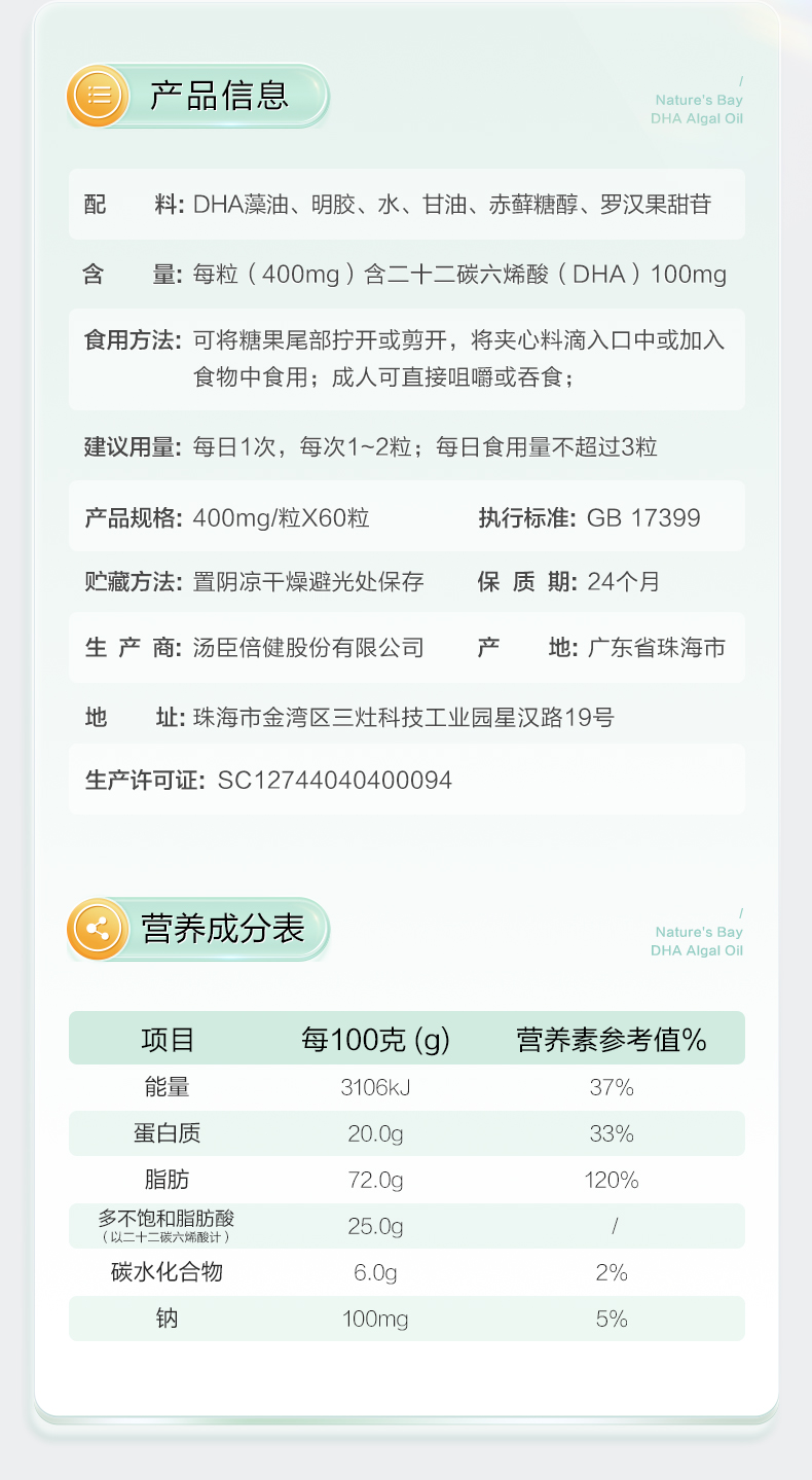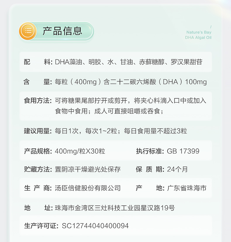 内容物仅为DHA藻油,没有加入任何不适合婴幼儿食用的香精色素添加剂