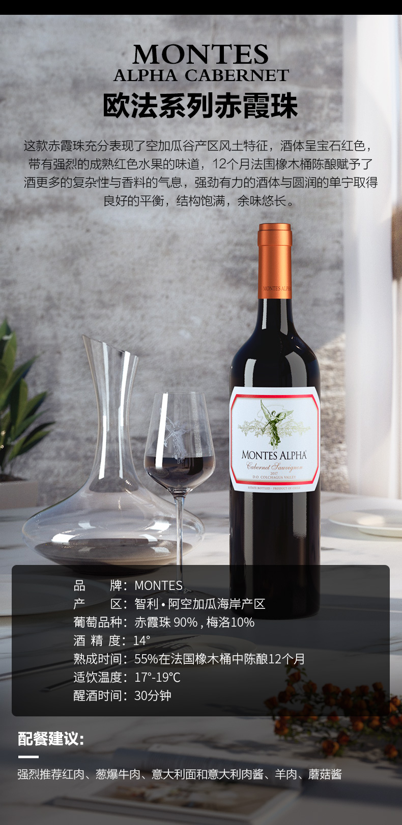 智利蒙特斯欧法赤霞珠红葡萄酒750ml