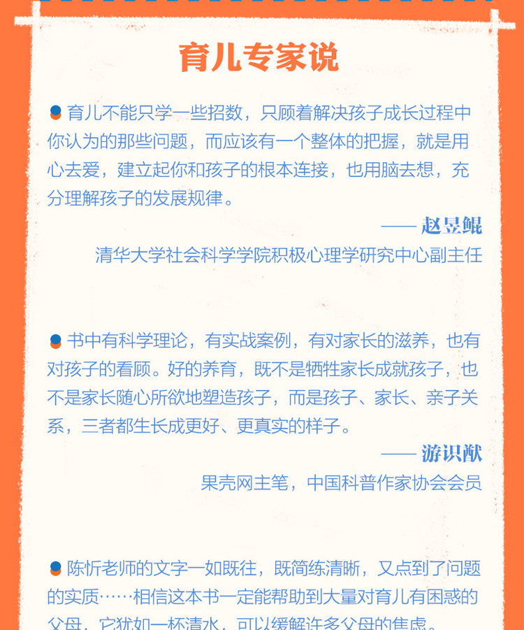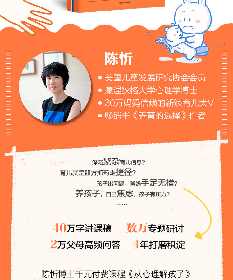 2.儿童发展心理研究专家陈忻博士千元付费课程《从心理解孩子》精华集结成书,浓缩40万字讲课稿、数万专题研讨、2万父母高频问答,历经4年打磨积淀。