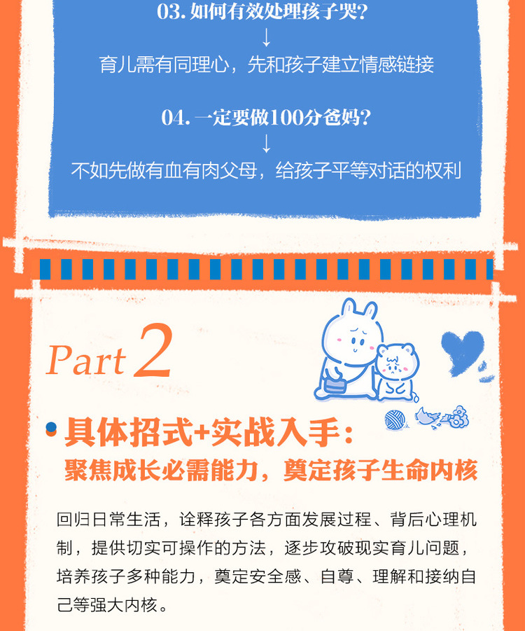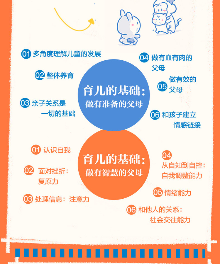 5.两大养育方向:“育儿基础”部分,科学指导,立足儿童发展规律,父母从心理解孩子;“育儿技能”部分,实战入手,聚焦成长必需能力,奠定孩子生命内核。