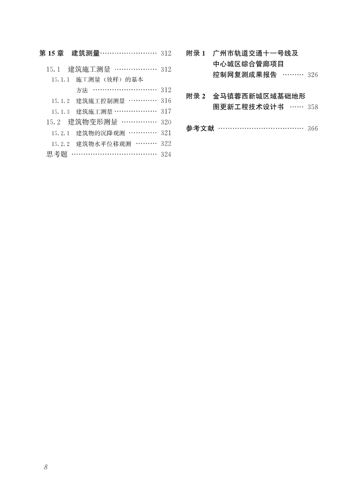 全书共分15章,包括绪论、水准测量基础、角度测量、直线水平距离测量与定向、工程坐标基础知识、地形图基本知识、测量误差的基本知识、高程测量、平面控制测量、地形图测量及其工程应用、平面位置测量、路线中线测量、全站仪测量技术、GPS测量技术和建筑测量。