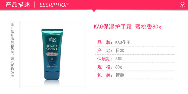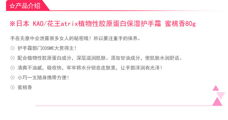 花王atrix植物胶原蛋白保湿护手霜 蜜桃香 80g