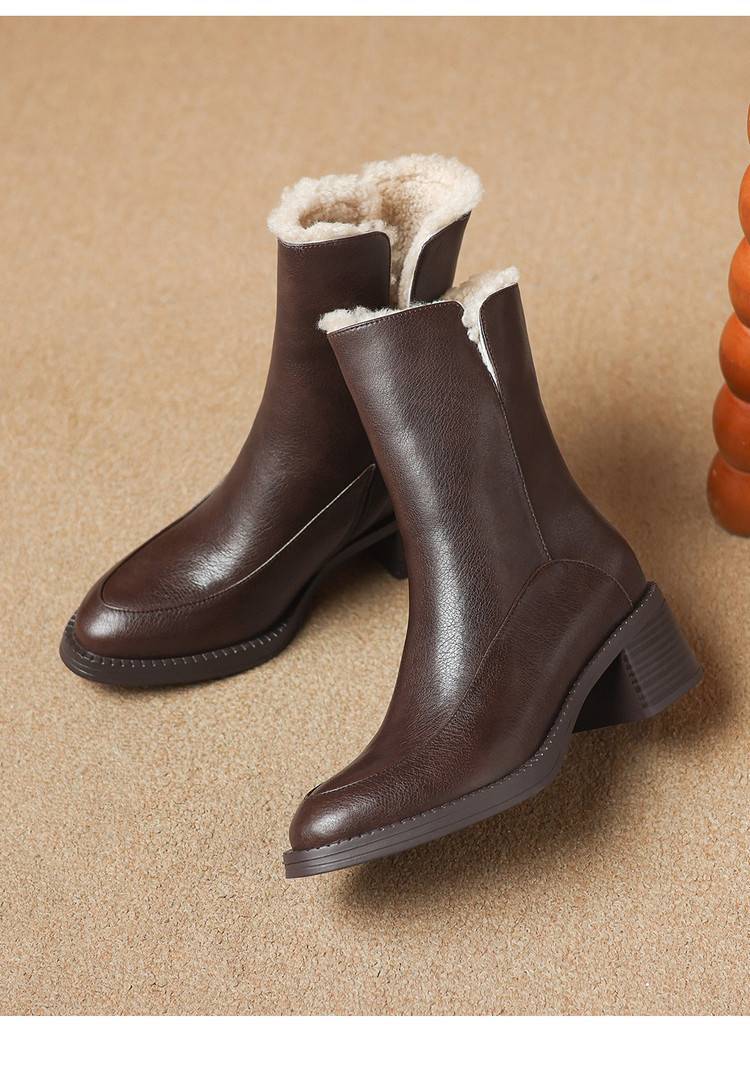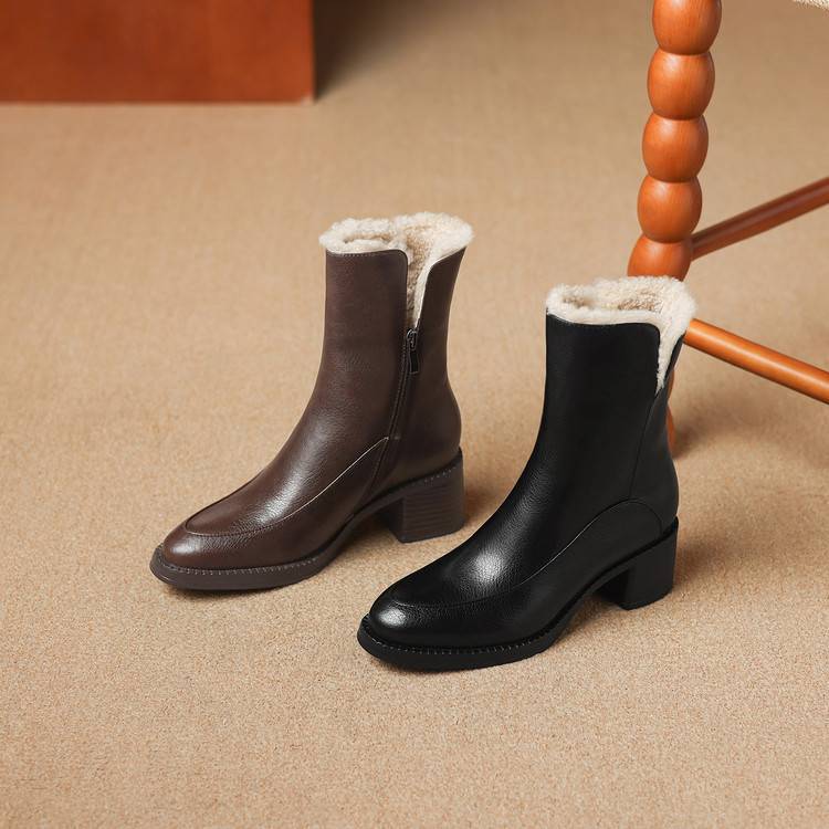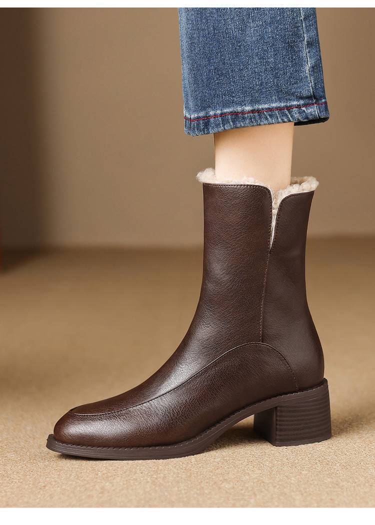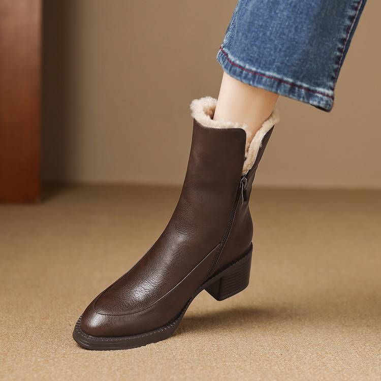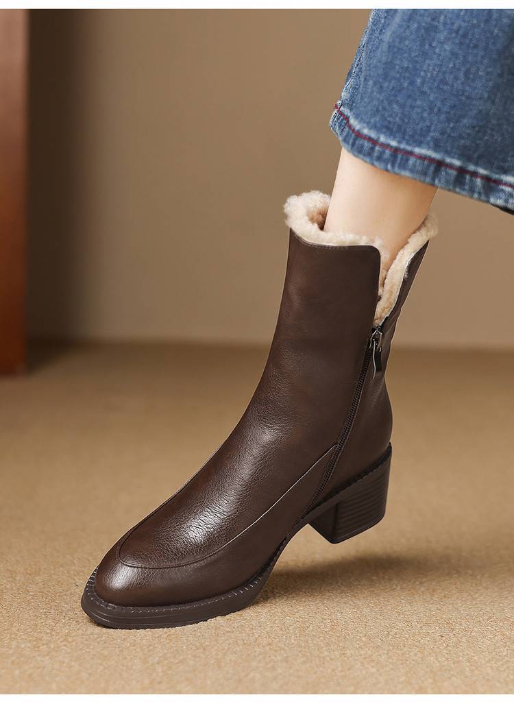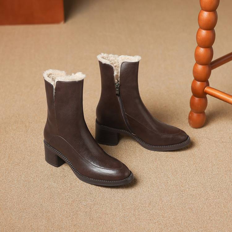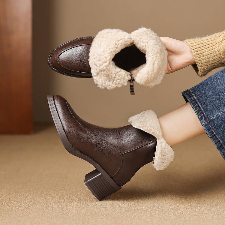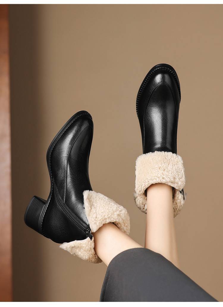 【预售5天】短靴子女保暖加绒新款冬季天雪地靴高粗跟黑棕色羊皮毛一体&699