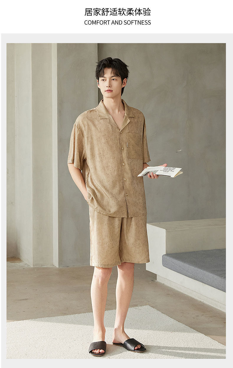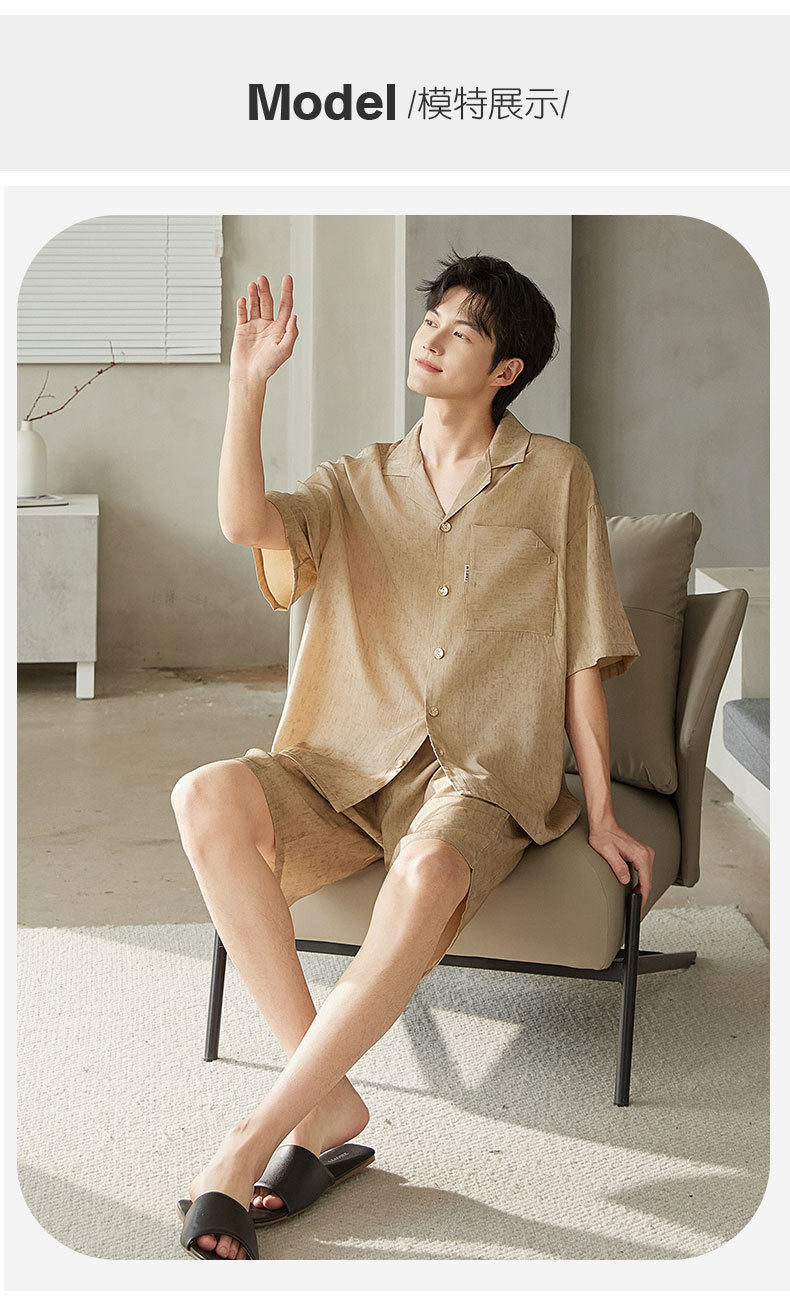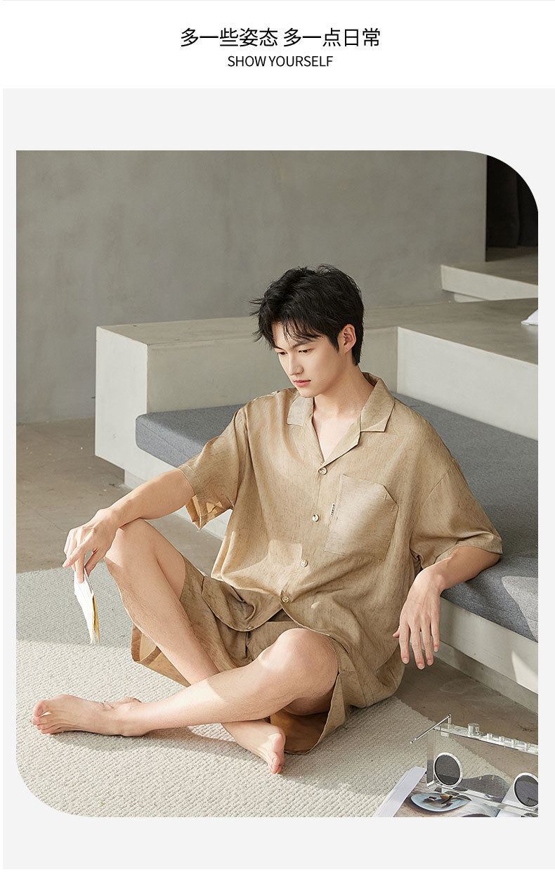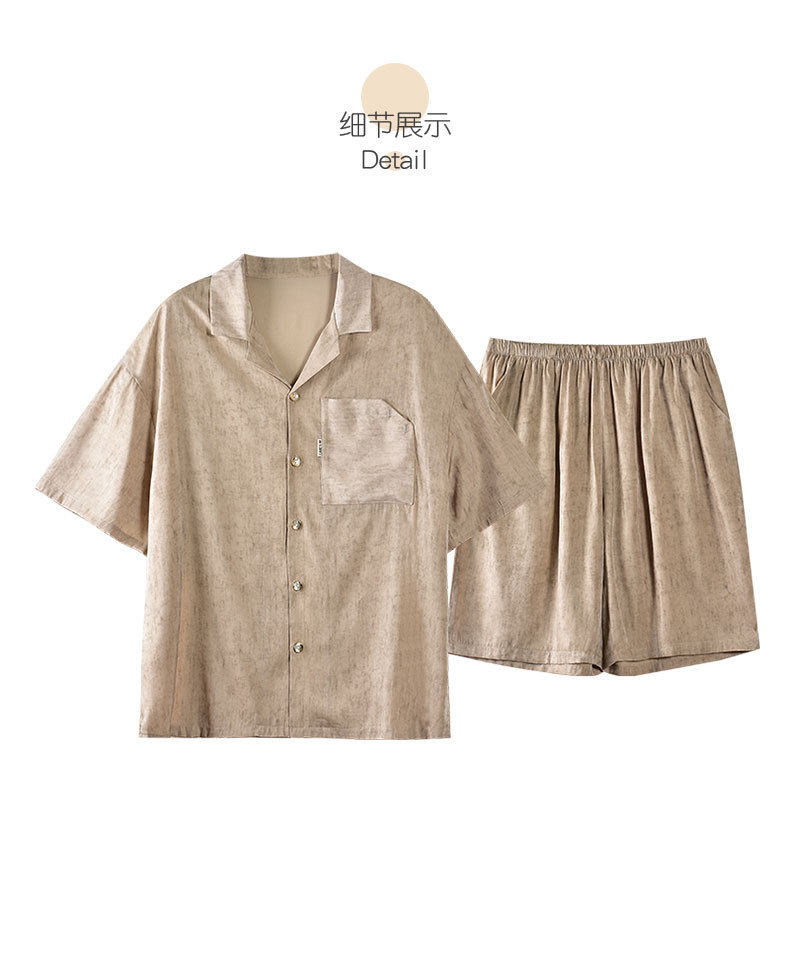 夏季短袖男士冰丝翻领短裤套装仿真丝薄款宽松开衫家居服可外穿 JL-5565