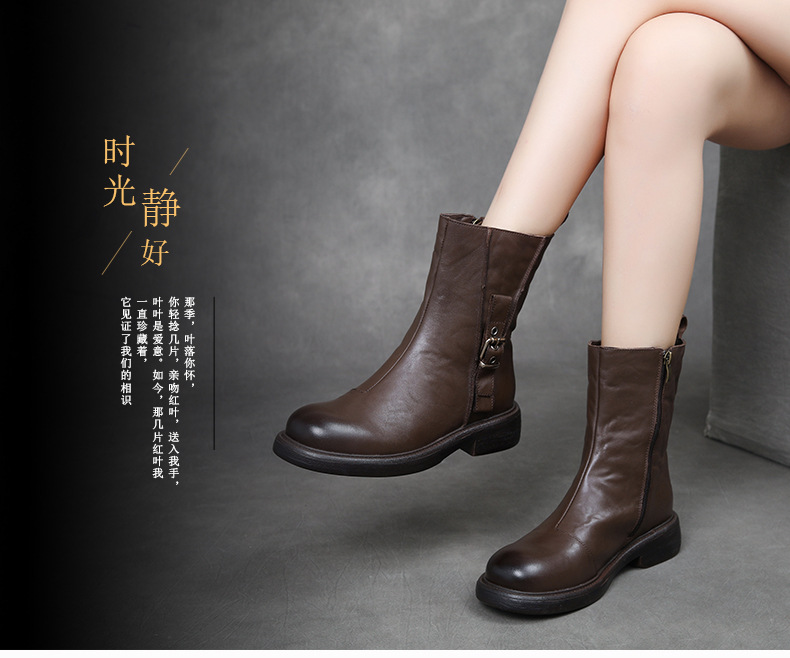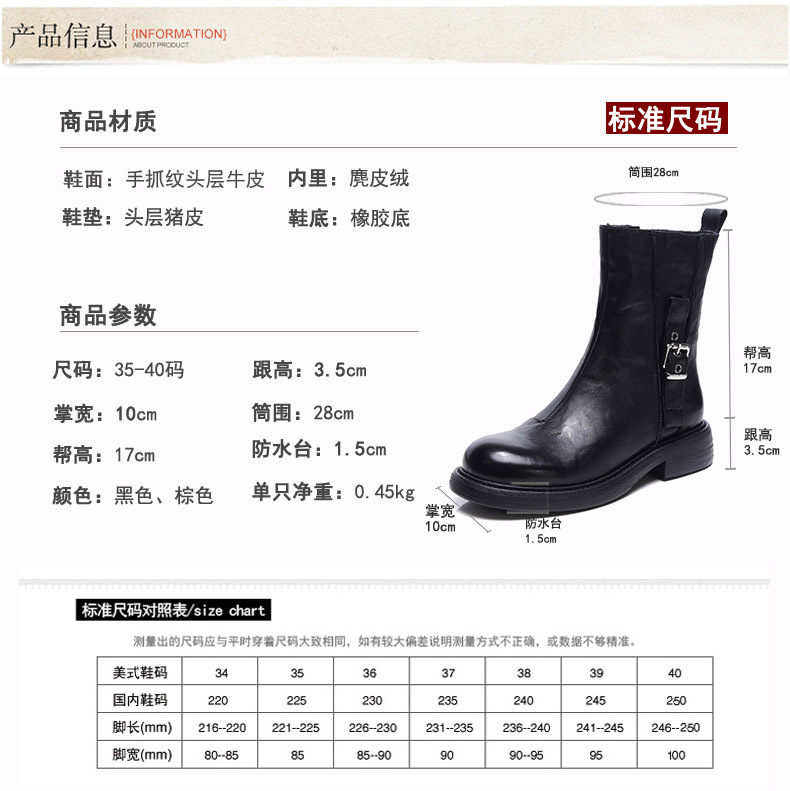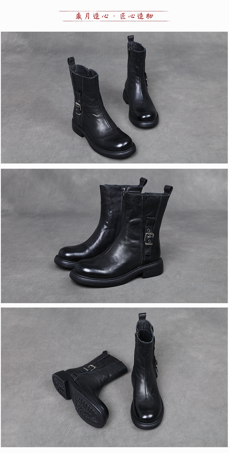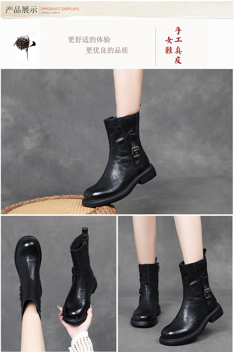 JH3052 2025秋冬轻奢手抓纹头层牛皮拉链马丁靴中靴真皮搭扣休闲女靴