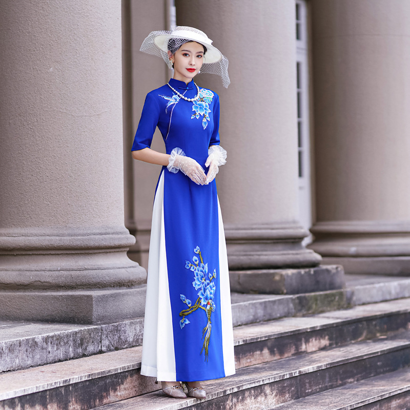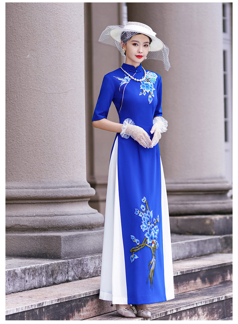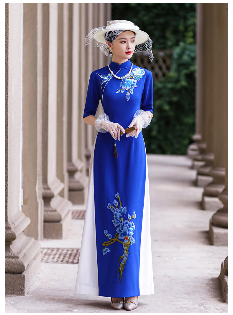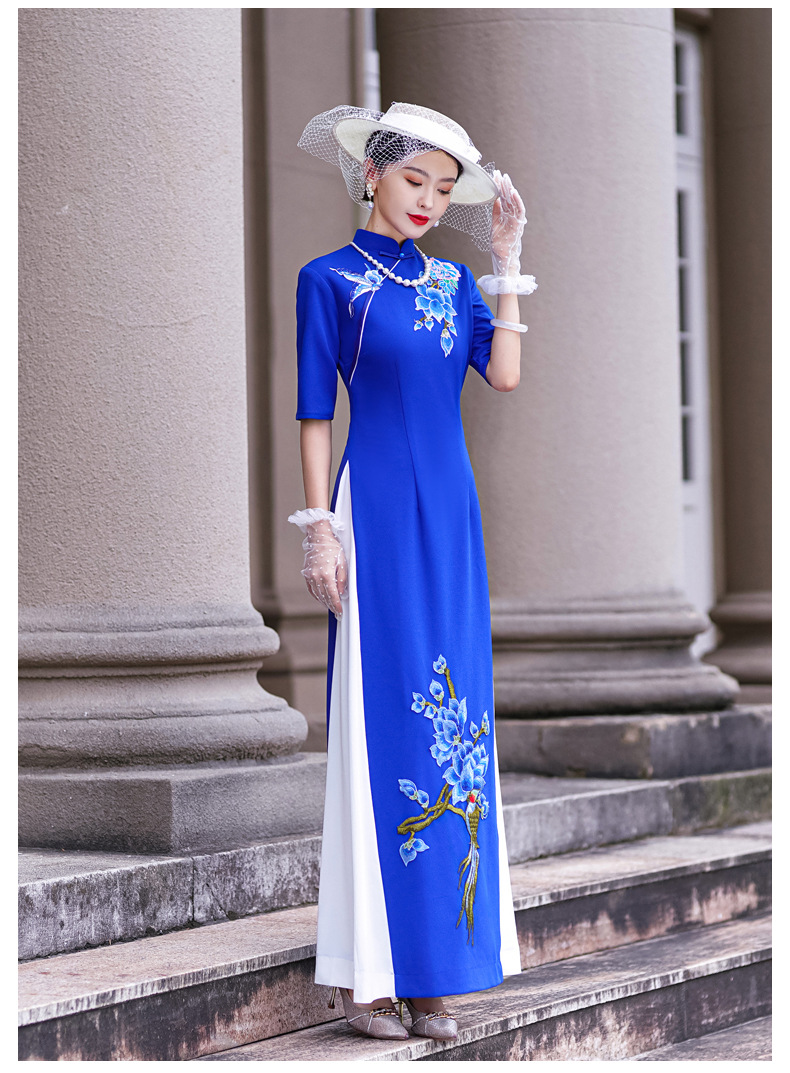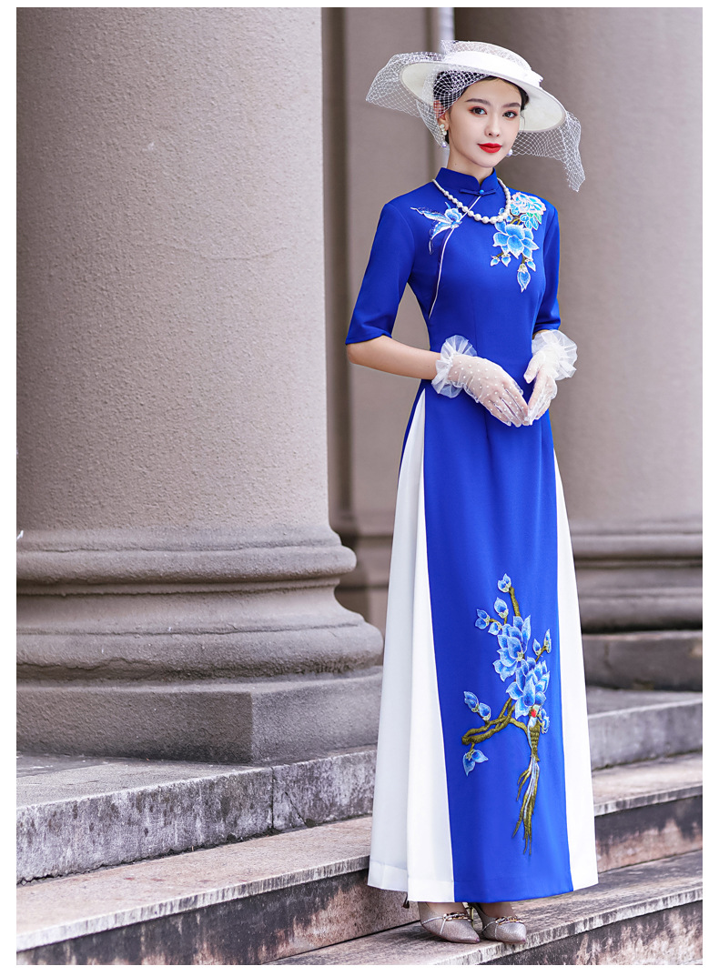 NL-2023新款越南奥黛旗袍中国风舞台走秀改良长款演出服高端复古旗袍