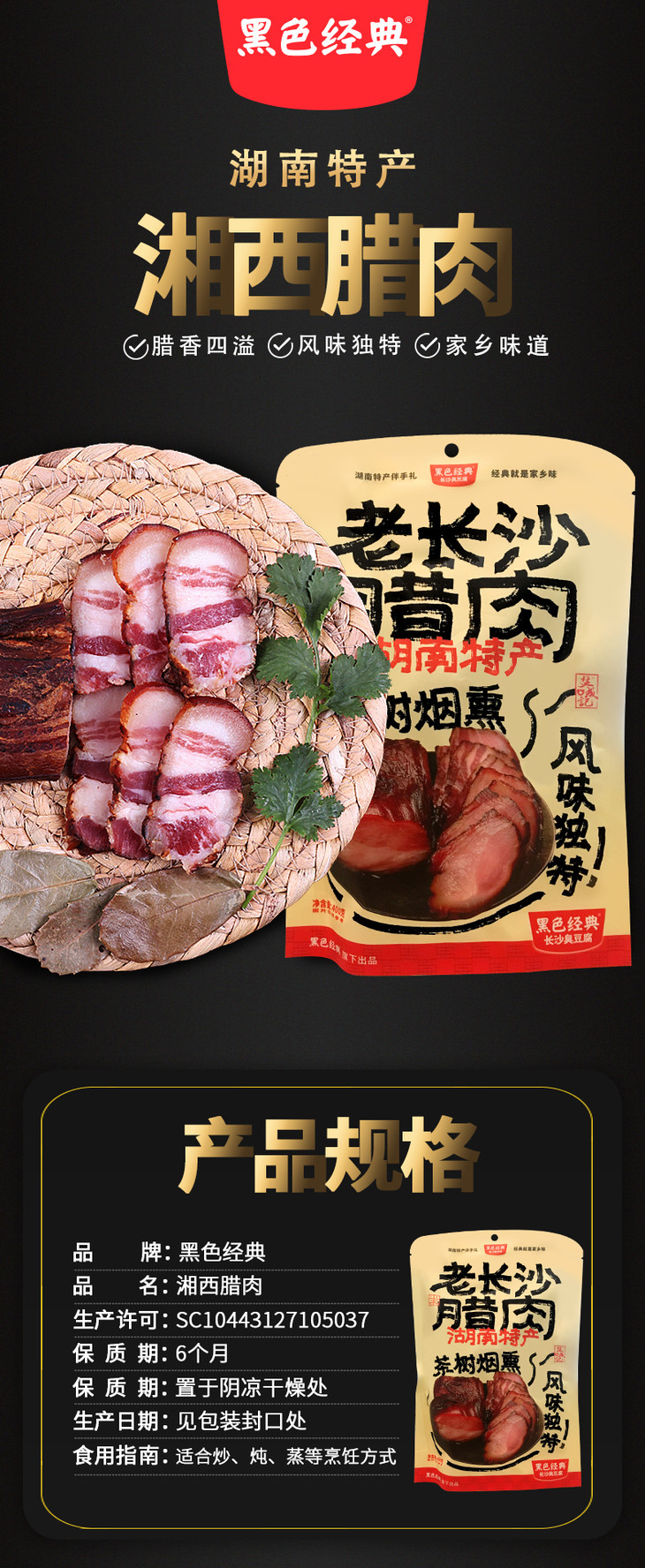 【会员特价局地包邮-2份装】黑色经典老长沙腊肉400g/袋 保质期至2023/3/27 限量200份