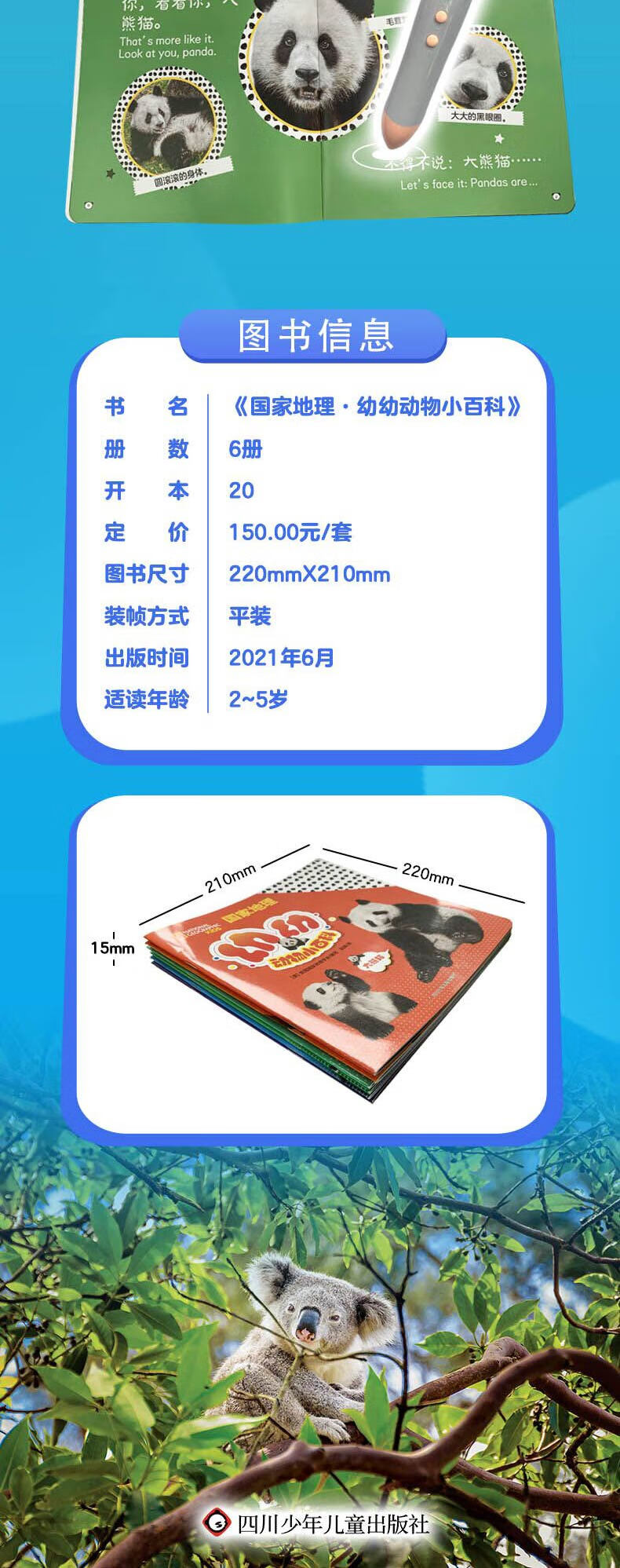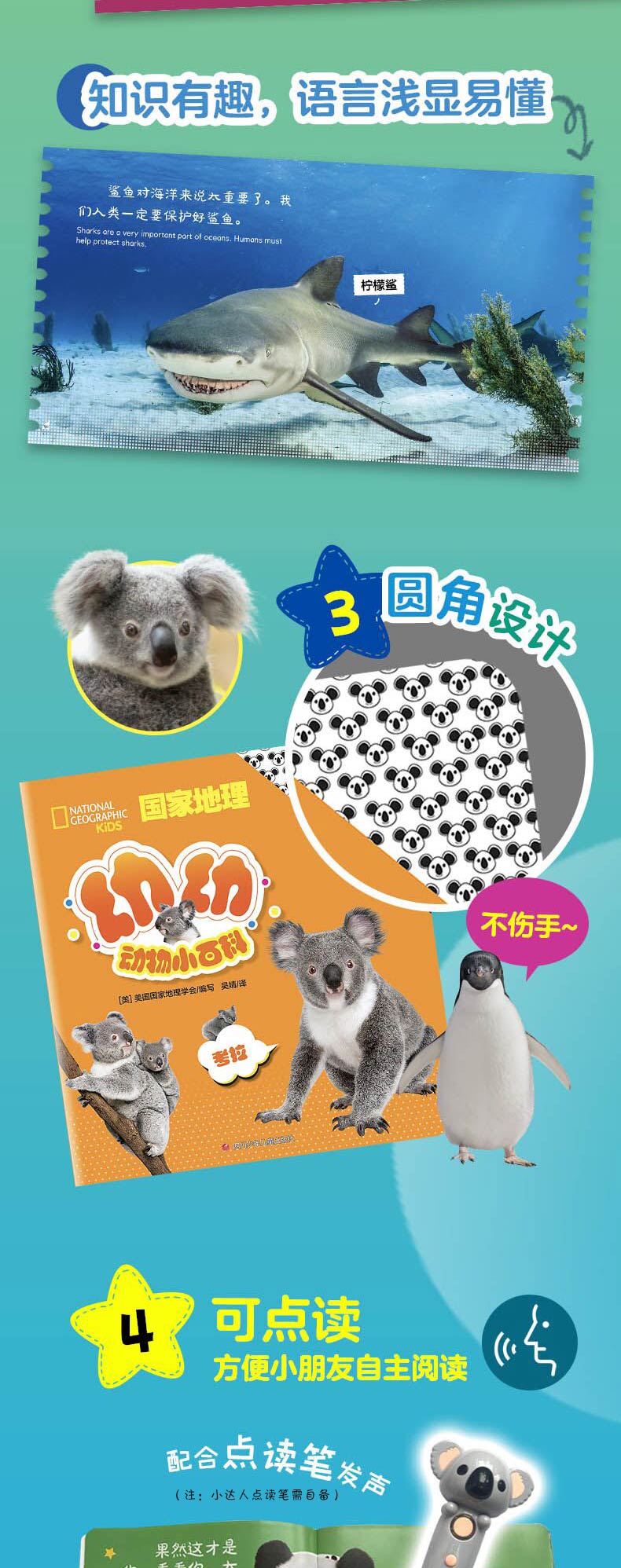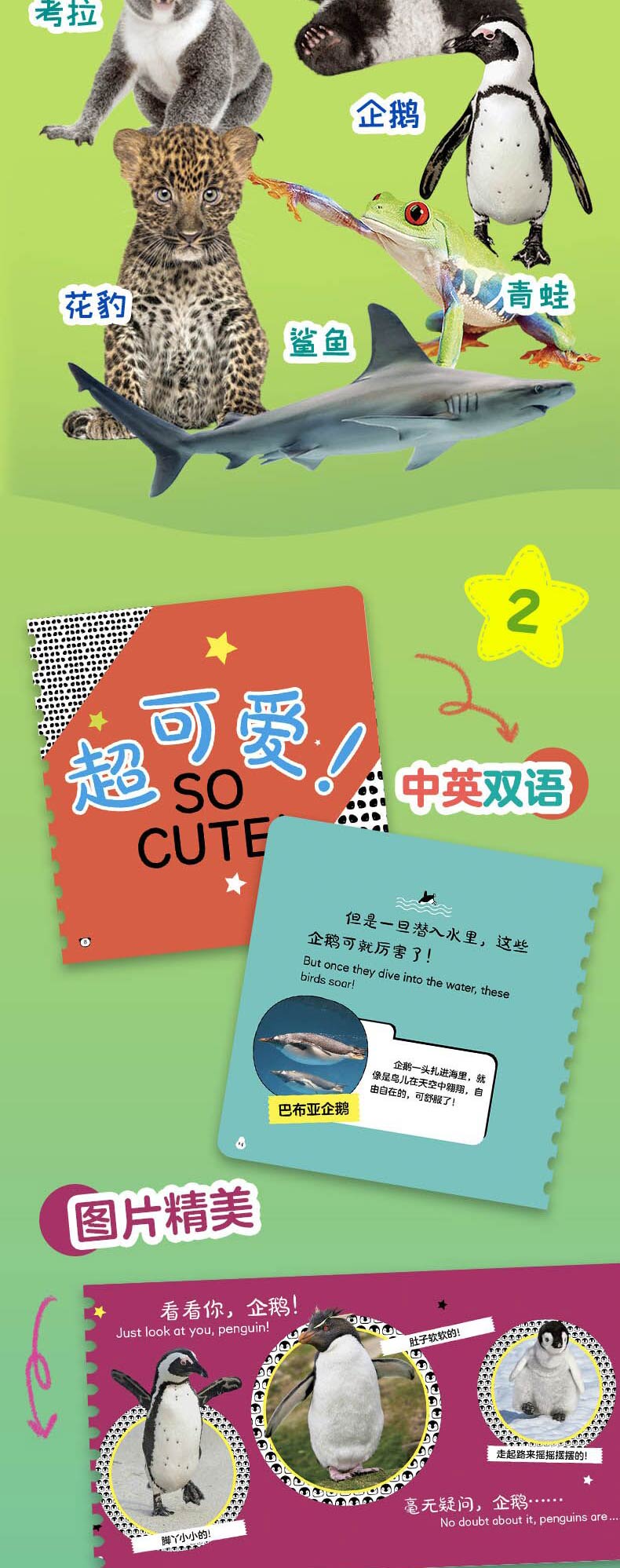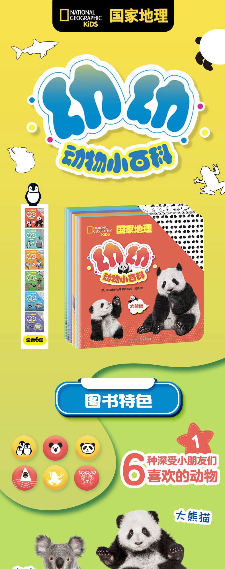 《国家地理幼幼动物小百科》系列共六册,是一套为幼儿打造的趣味英语丛书,带有点读功能,以可爱的版式、可爱的图片、可爱的动物、可爱的开本为孩子们介绍了好玩的动物百科知识。区别于已经出版的《国家地理儿童小百科》系列,这套的针对读者年龄段更低,知识点简单而全面,满足了2-4岁孩子的需要。
