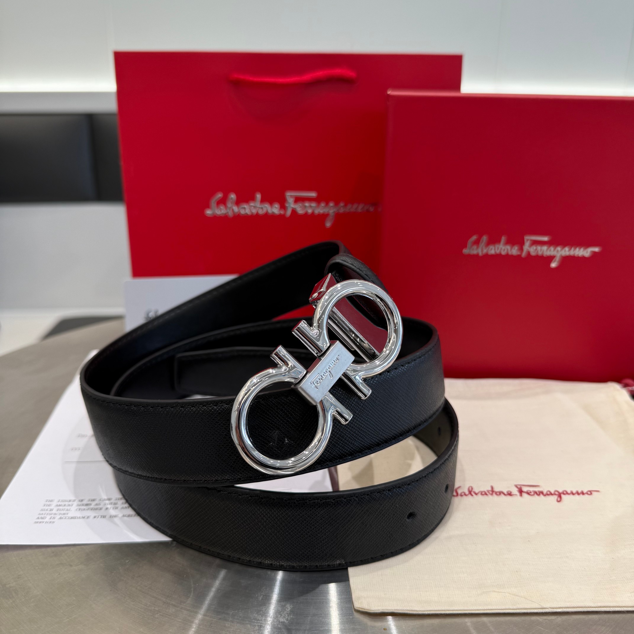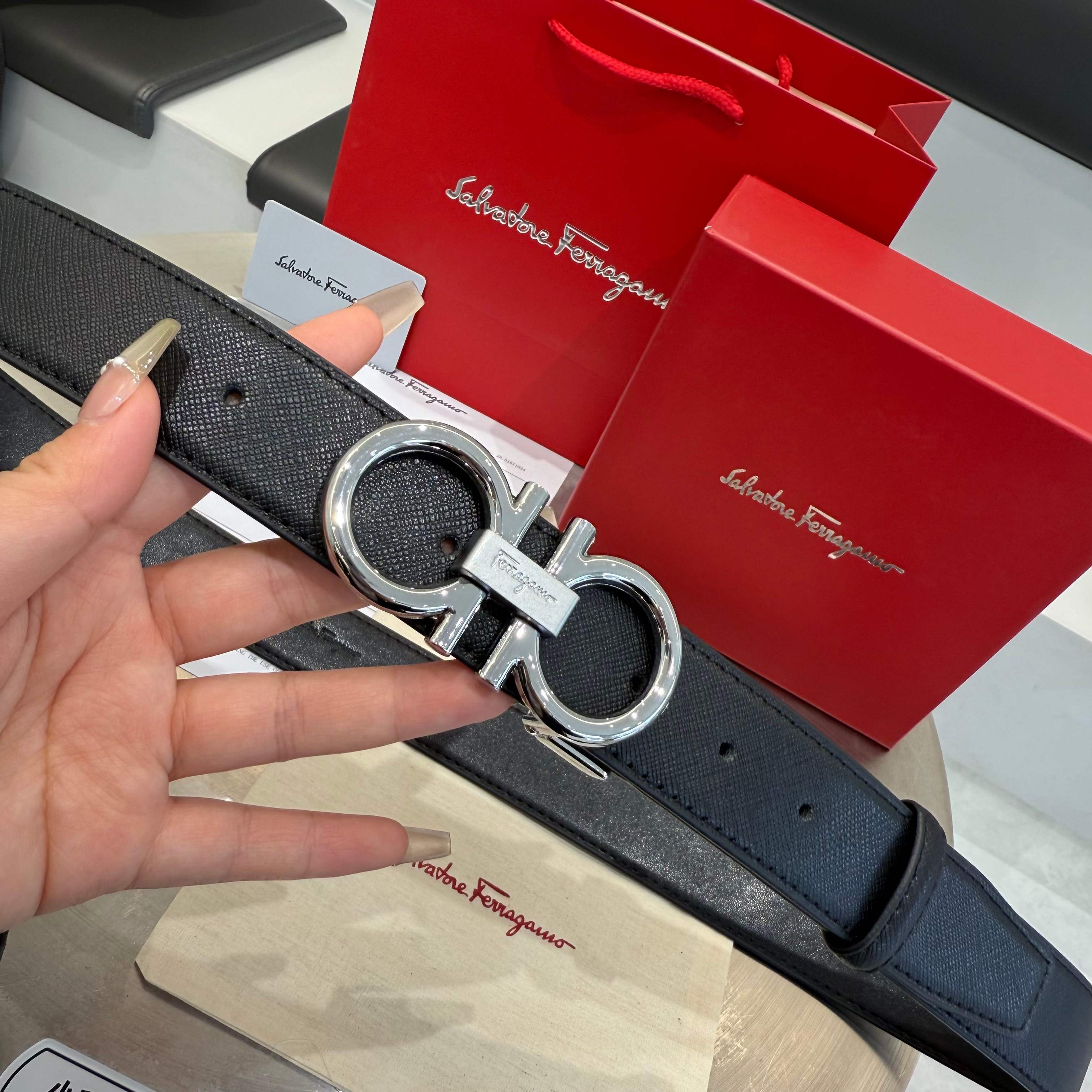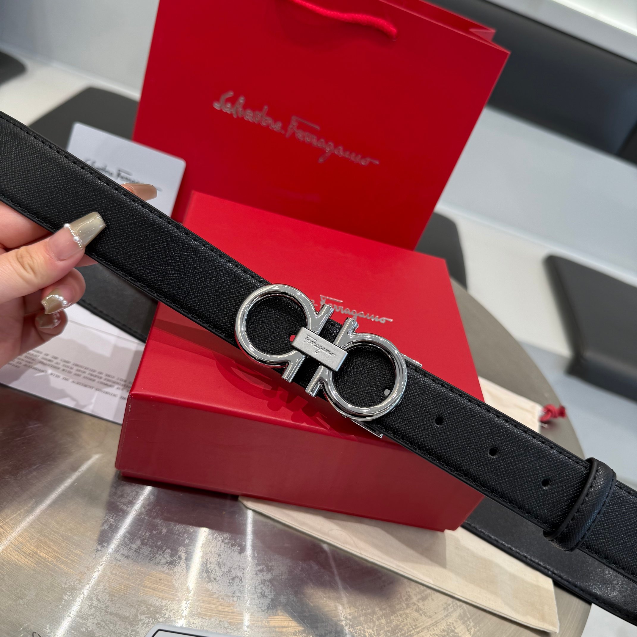 2025新款来袭🎉FERRAGAMO/菲拉格慕皮带,黑色荔枝纹腰带,配红色礼盒包装,菲拉格慕皮带专柜🈶售✨牛逼质量带身采用进口二层牛皮🐂 精致油边,搭配原版钢扣💍不褪色。不挑任何年龄,送老公,男朋友,爸爸都可以,彰显气质,宽度3.4cm,有配打孔器,码数统一120cm,长度可以剪。
