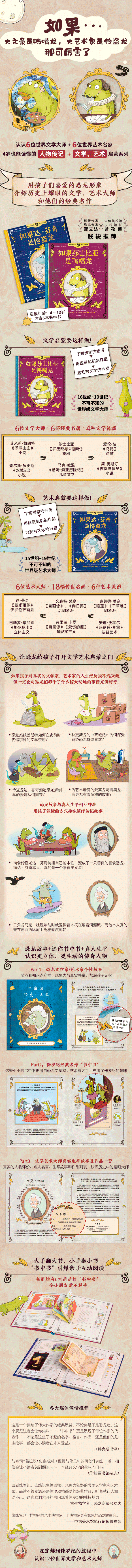 本套书一共两本,一本是《如果莎士比亚是鸭嘴龙》,介绍6位在世界文学史上赫赫有名的作家和他们的名著。另一本是《如果达·芬奇是伶盗龙》,带领孩子认识世界艺术史上重量级的画家和他们的名画。