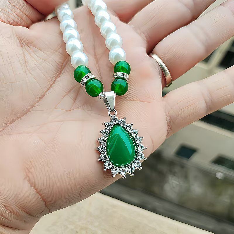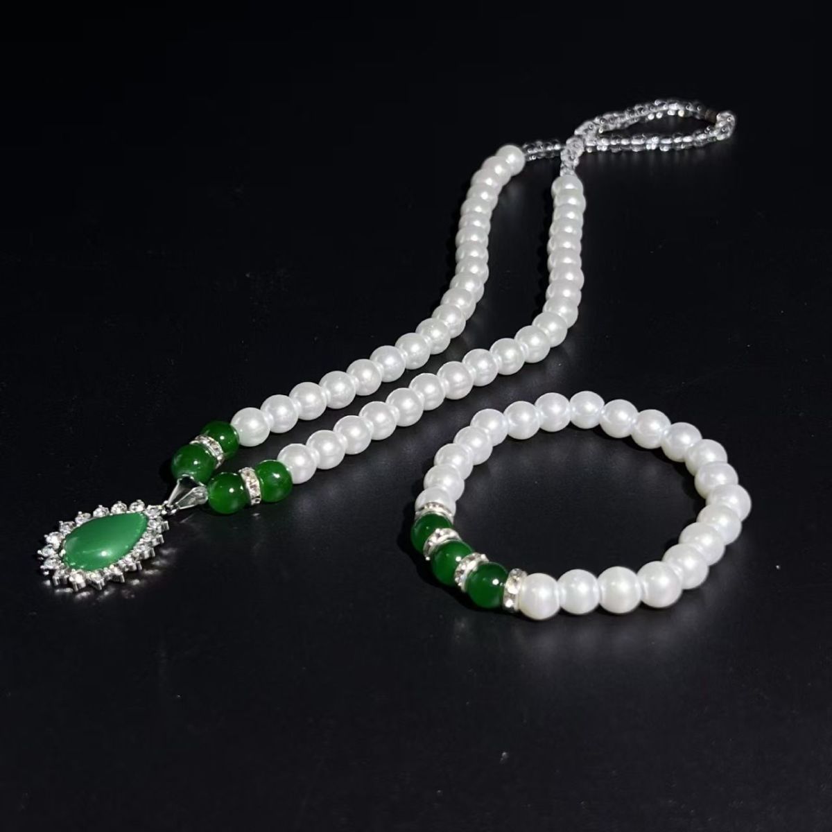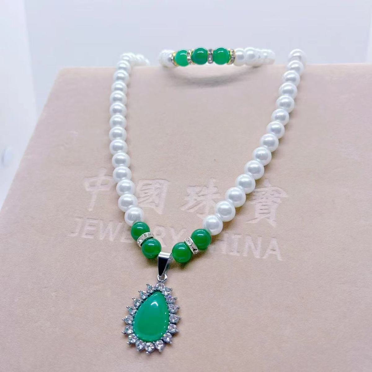 【高端大气】妈妈链珍珠圆珠项链点钻套装绿玉髓礼物-#SSY7
