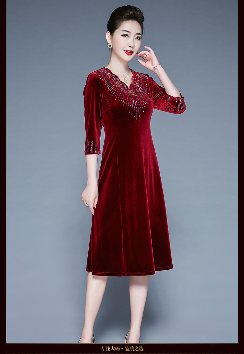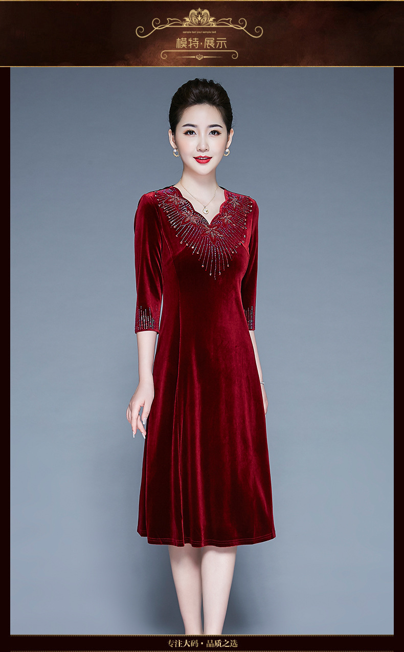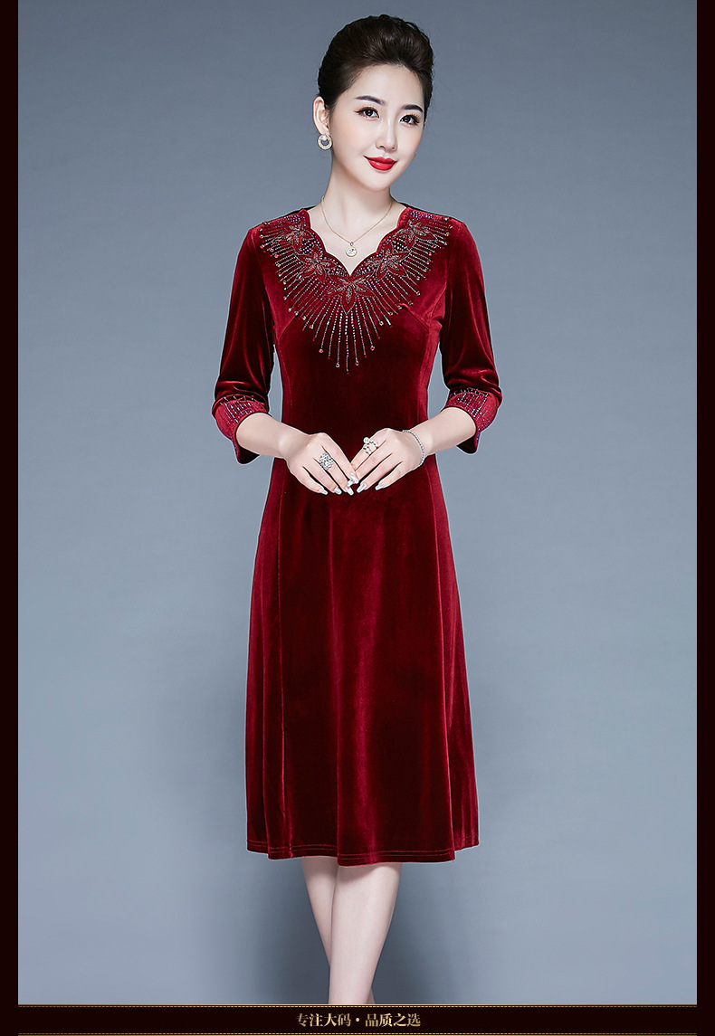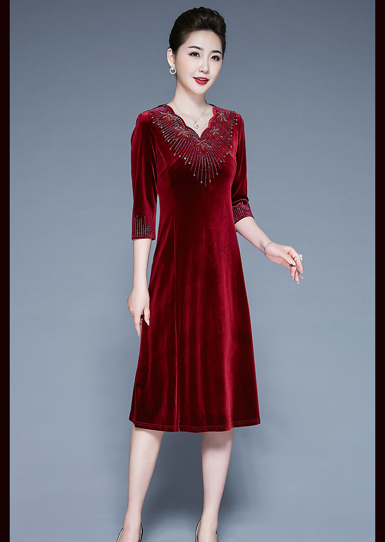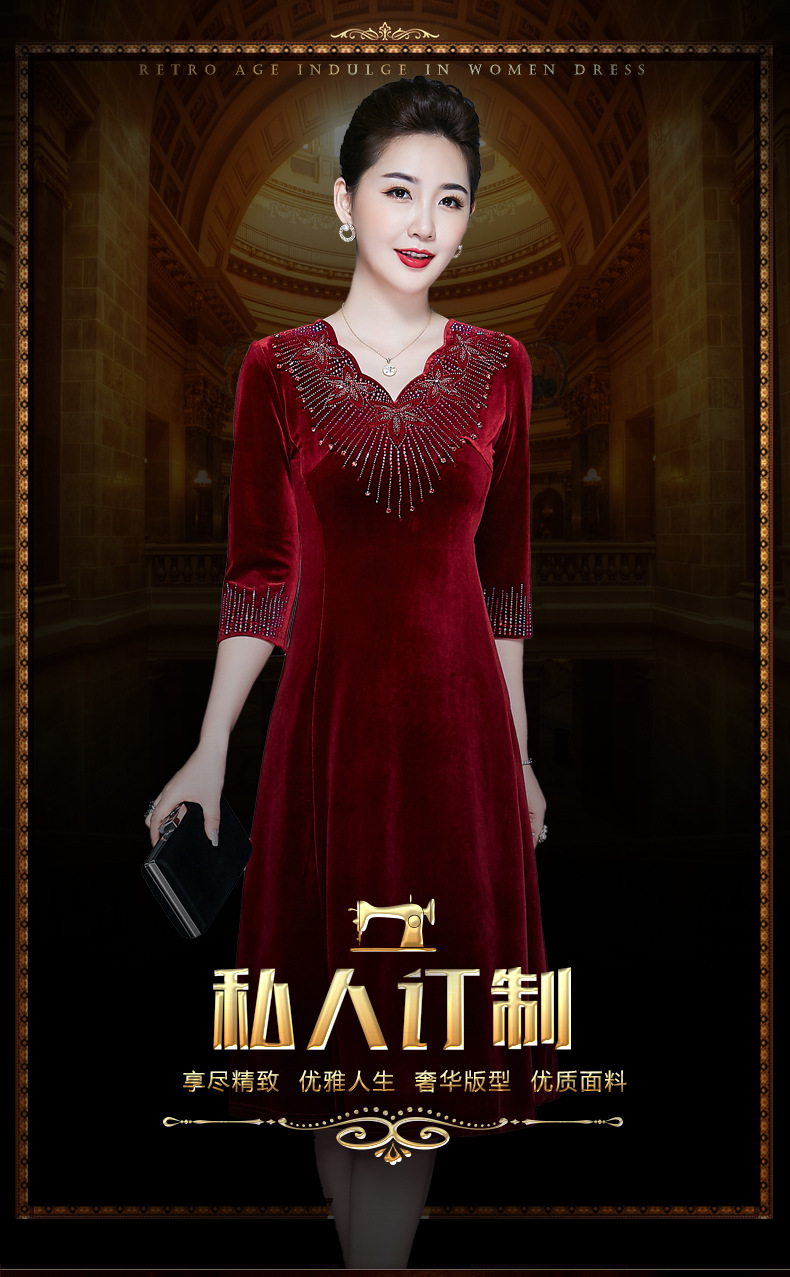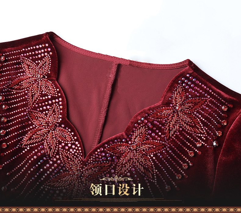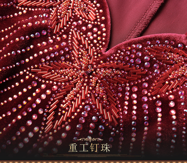 JC-2099新款重工钉珠V领红色金丝绒连衣裙中年高贵婚宴旗袍裙