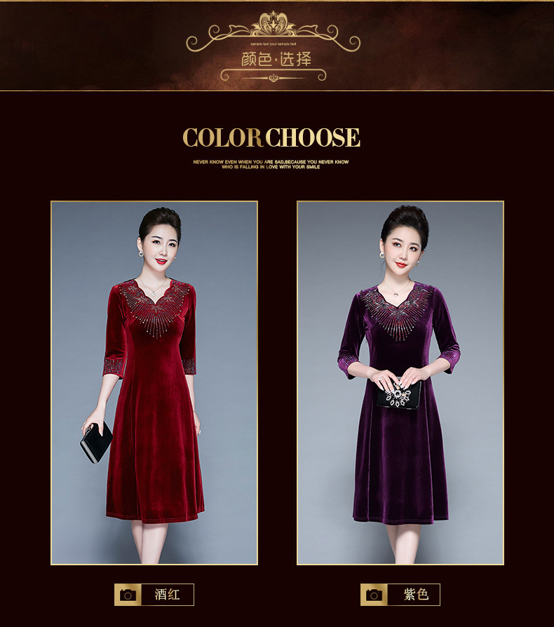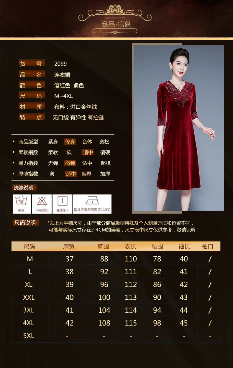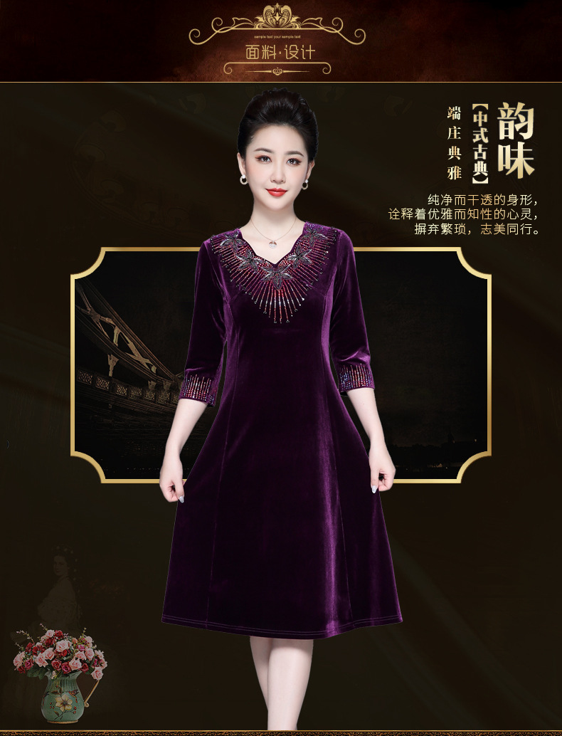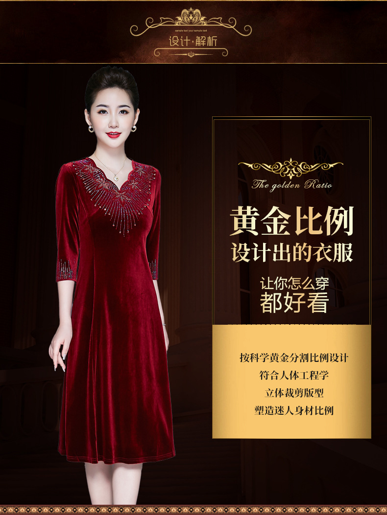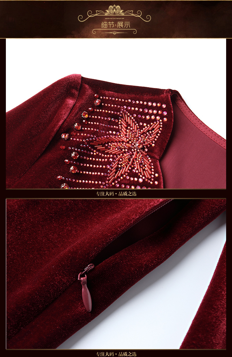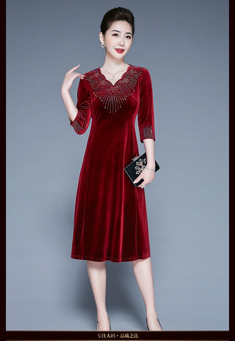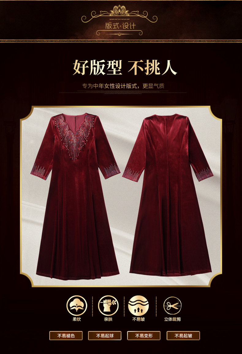 JC-2099新款重工钉珠V领红色金丝绒连衣裙中年高贵婚宴旗袍裙