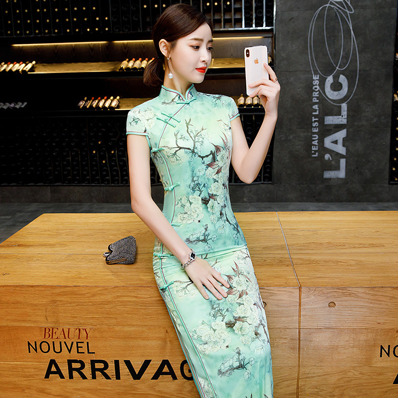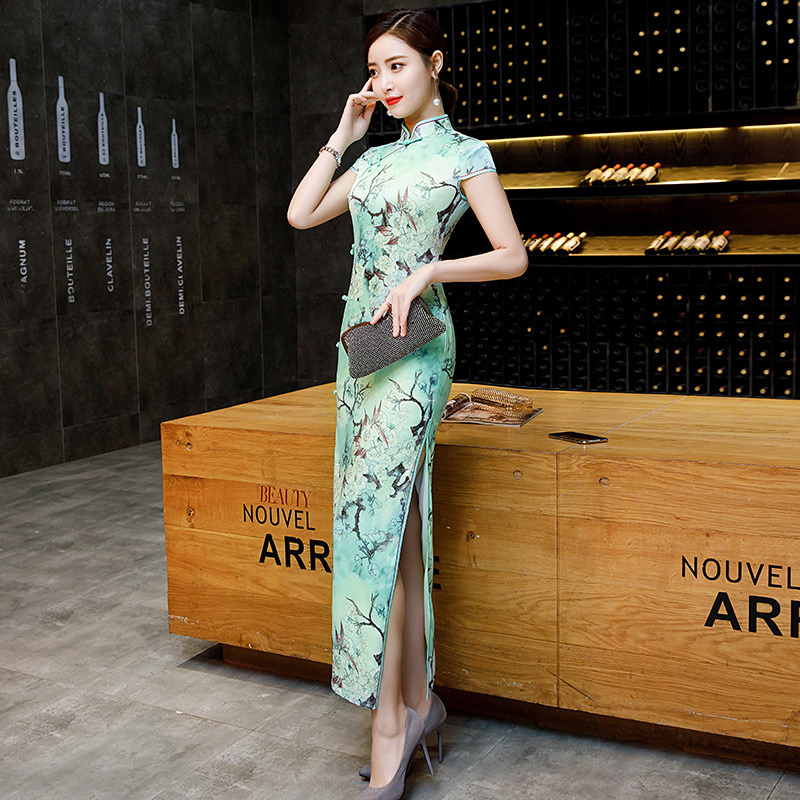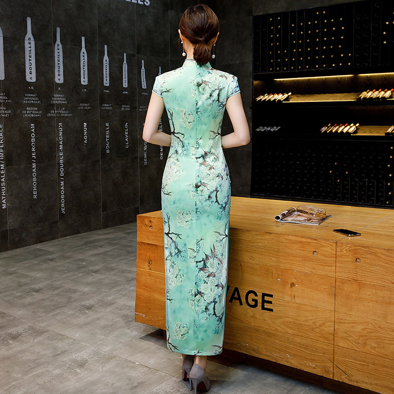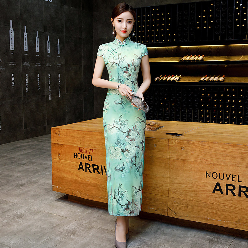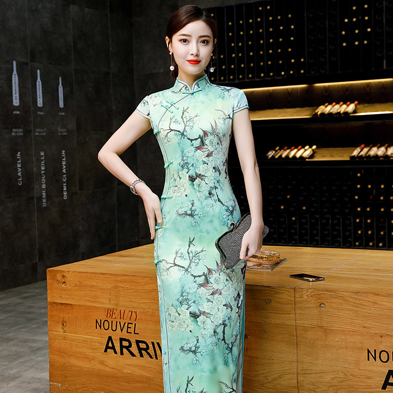 SC3759双层侧八扣短袖长款改良旗袍2025新款女走秀演出服装