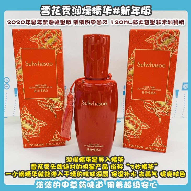 雪花秀润燥精华#新年版👍2020年鼠年新春限量版❤,满满的中国风,120ML敲大容量非常划算哦🉐!润燥精华是导入精华💧,雪花秀头牌绝对的明星产品🌟!俗称“3️⃣秒精华”,一小滴精华就能渗入干燥的肌肤深层,保湿补水💦、去黄气、提亮肤色、平衡水油〰。打开皮肤通道,让水乳更好的吸收🌬,控油效果也是很棒的呀!痘痘肌肤也合适😊,淡淡的中草药味道,用着超级安心。