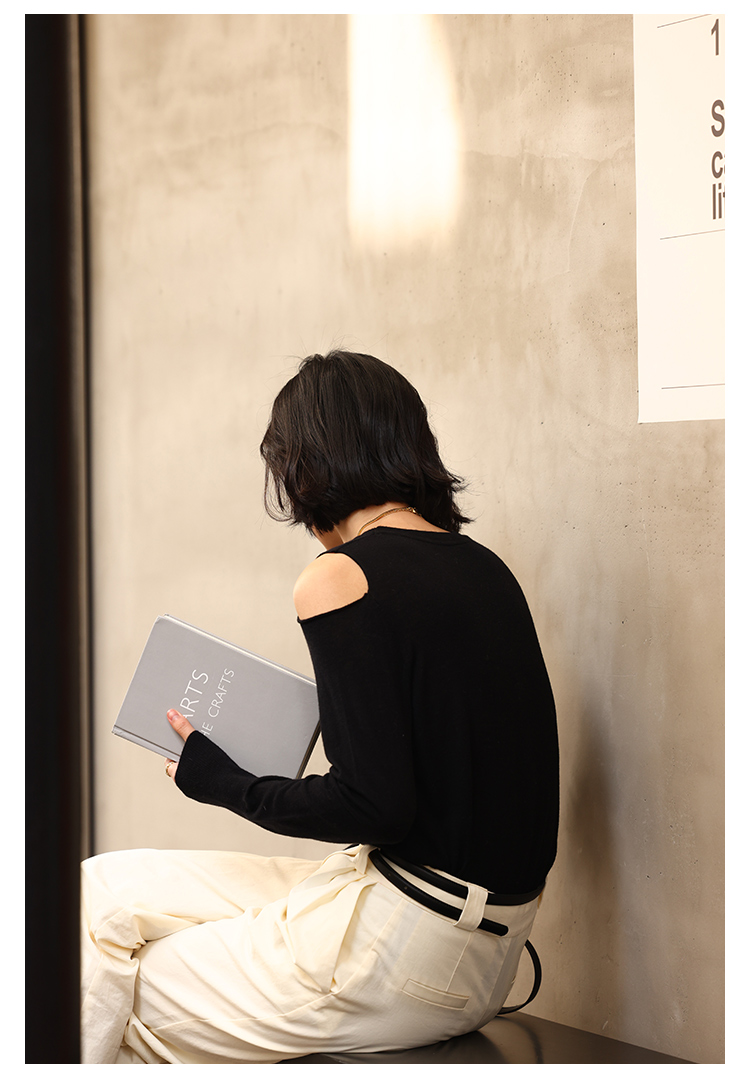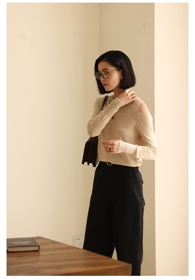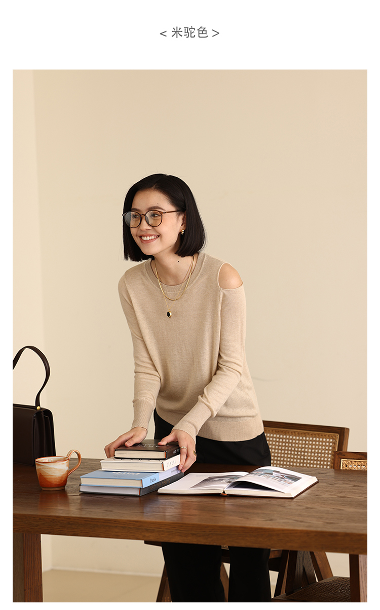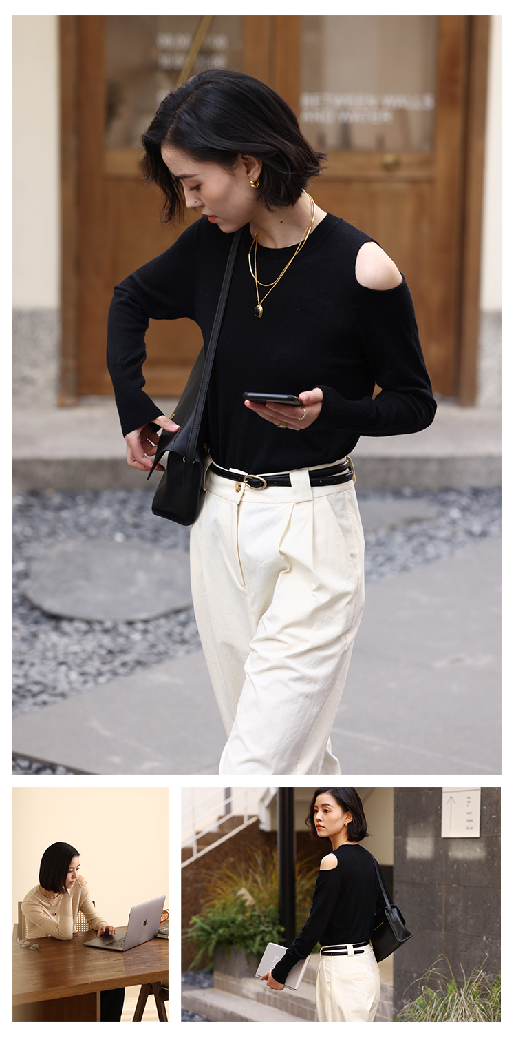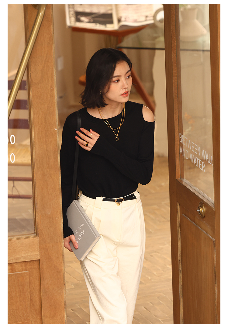 HeyDress法式针织衫女春季圆领露肩设计感宽松T恤小众打底衫上衣