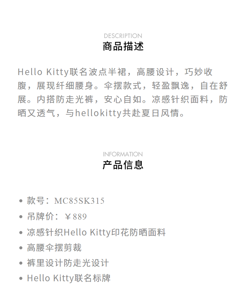 【Hello Kitty时尚防晒系列】MAXRIENYKitty高腰防晒伞裙波点短裙(货号:MC85SK315)