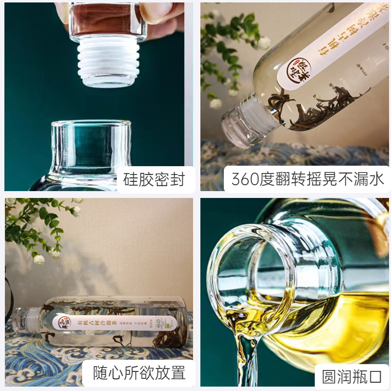 密封的茶瓶有清晰的刻度,高亮通透的瓶身更显茶汤颜色,加厚高硼硅玻璃材质手感好,圆润瓶口直接饮用口感舒适。