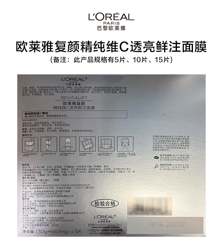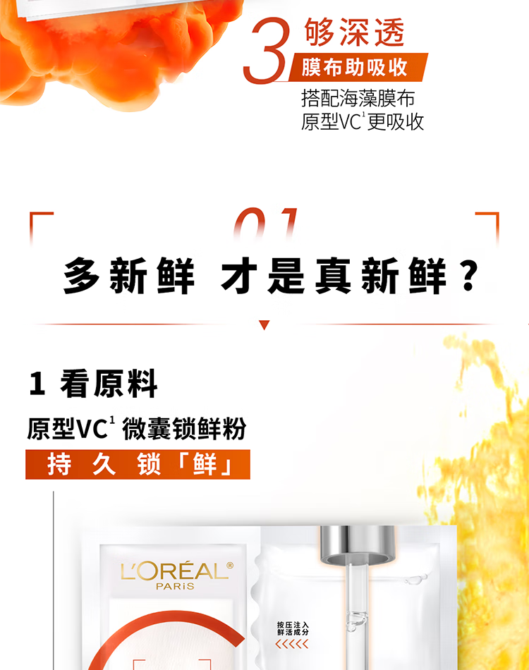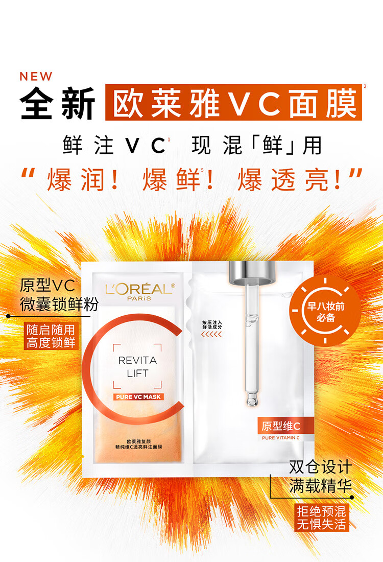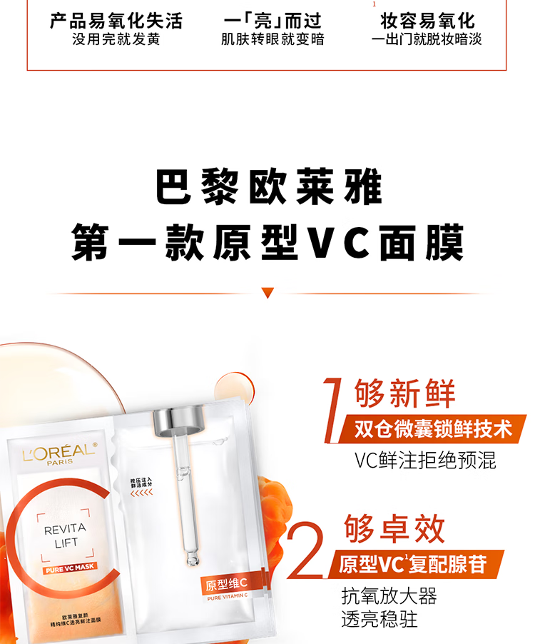 欧莱雅复颜精纯维C透亮鲜注面膜5片提亮肤色