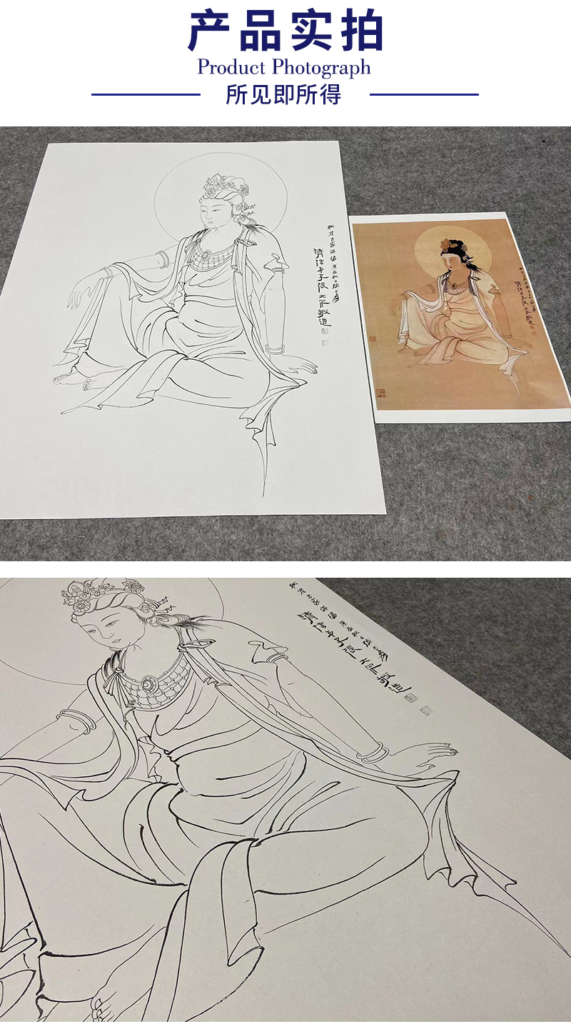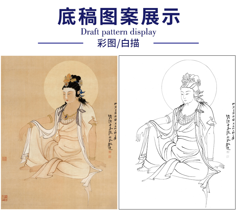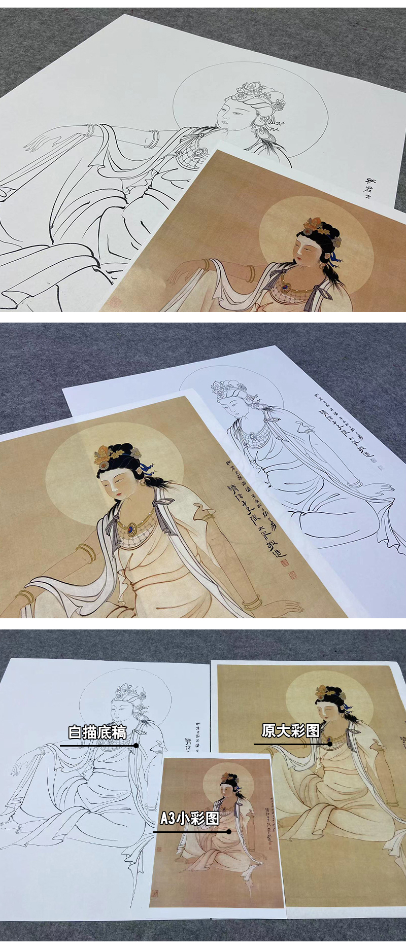 【大彩图】张大千工笔画白描底稿《观音图》佛像菩萨临摹勾线高清打印稿QD64