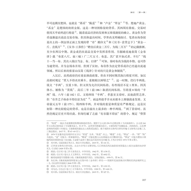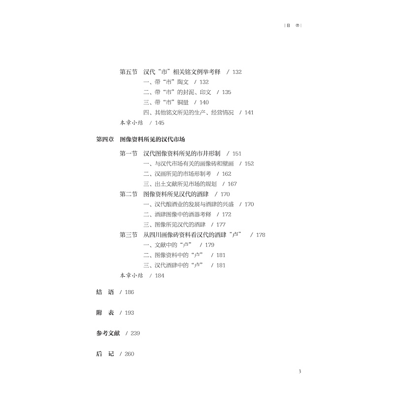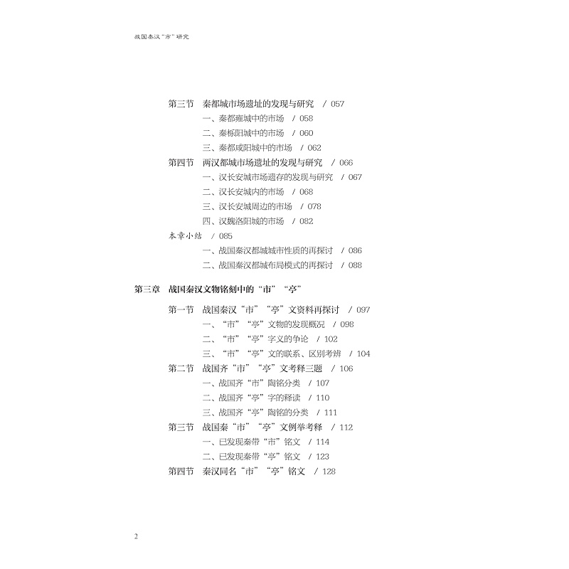 本书是关于战国秦汉商业考古的初步研究,除绪论(研究对象、学术史回顾和本书的材料依据)、附论外,共三章。第一章共五节,通过对战国秦汉都城城址中市场位置及其布局规律的梳理,解析各阶段政府对市场的布局管理情况;第二章共五节,前四节通过对战国齐、燕、楚、晋、秦等国和秦、汉时期带“市”“亭”文资料的统计和例举考释,详细探究这一阶段市场的具体设置、管理情况。第五节由带“市”“亭”文资料的发现情况重新推定“市”“亭”文的内涵。第四章共三节,运用二重证据法对相关图像资料进行分析,考究东汉市场、酒肆布局的具体细节。