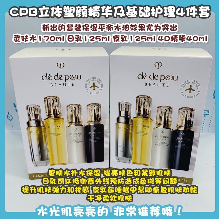 CPB立体塑颜精华及基础护理4件套👍新出的套装保湿平衡水油💦效果尤为突出👏。☑️爽肤水补水保湿,提亮肤色和紧致肌肤。☑️日乳可以抵御紫外线预防造成色斑等问题,提升肌肤弹力和妆感。☑️夜乳在睡眠中帮助恢复肌肤功能,干净柔软肌肤。☑️4D精华促进胶原蛋白活力、再生。令粗糙干燥松弛的肌肤充满生机,恢复丰润Q弹。完全没有夸大其词,用了你真的会发现第二天皮肤很有光泽感✨✨,水光肌亮亮的,非常推荐哦!套装包括:爽肤水170ml➕日乳125ml➕夜乳125ml➕4D精华40ml。