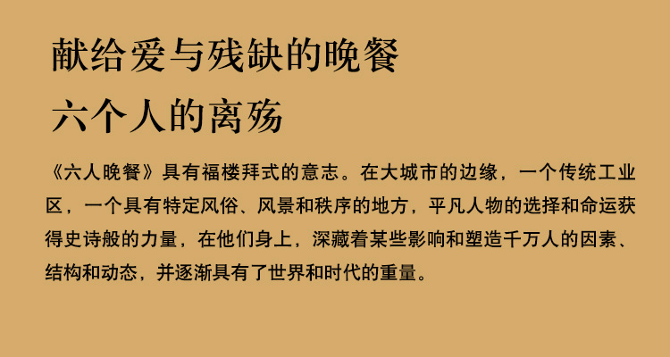 《六人晚餐》取材当下,故事发生于城郊结合部的老旧厂区,拖曳着化工产业的沉重阴影与物质进步的巨大代价,小说讲述了两个单亲家庭六个主人公的艰难与分合,他们相互间的靠近、取暖与伤害,偶然的同行与必然的离散。化工厂会计苏琴和工人丁伯刚两个单亲家庭相遇了。苏琴每周六带着孩子们到丁家,两家人共进丰盛的晚餐。每周三苏琴都要去丁家过夜,丁家待业的儿子丁成功和苏琴漂亮、一心读书上进的女儿晓蓝产生了朦胧的恋情。苏琴发现两人的爱情苗头后,不能容忍女儿嫁给不成功的丁成功。丁伯刚越来越嗜酒,在工厂下岗、买断工龄的浪潮中死去。丁成功和晓蓝在爱情的相思和世俗成功学的夹缝中痛苦挣扎。*终,怀有身孕的晓蓝毅然放弃世俗意义上的成功家庭,去找丁成功。然而,一场大,丁成功死了,晓蓝也躺在病床上……