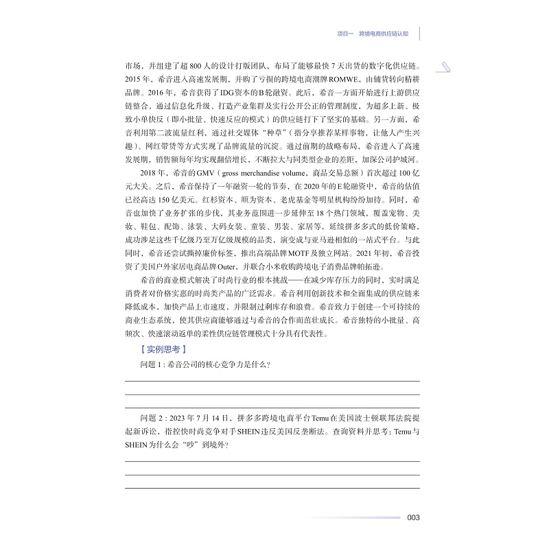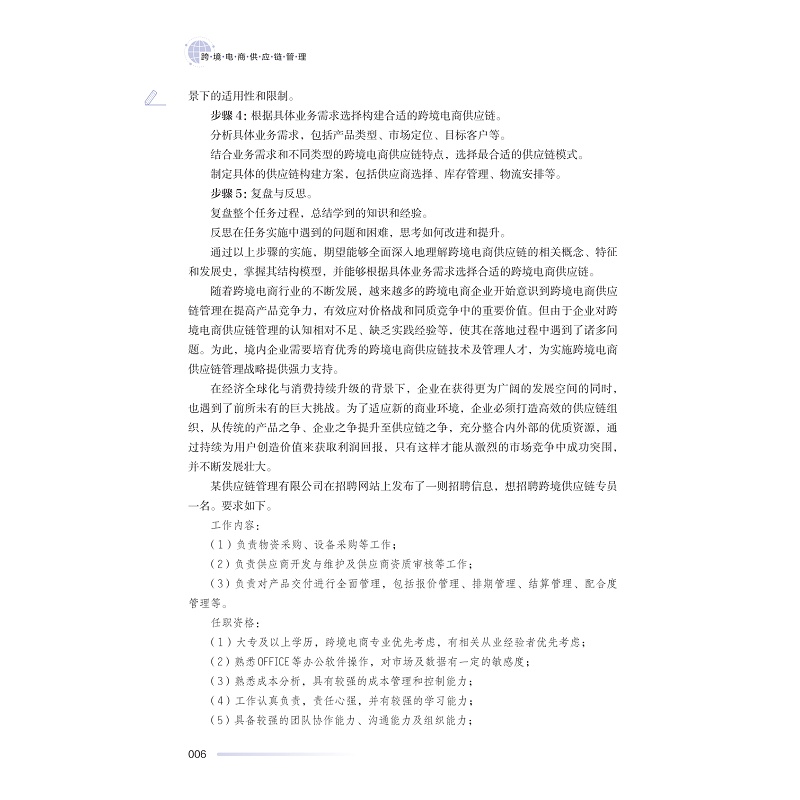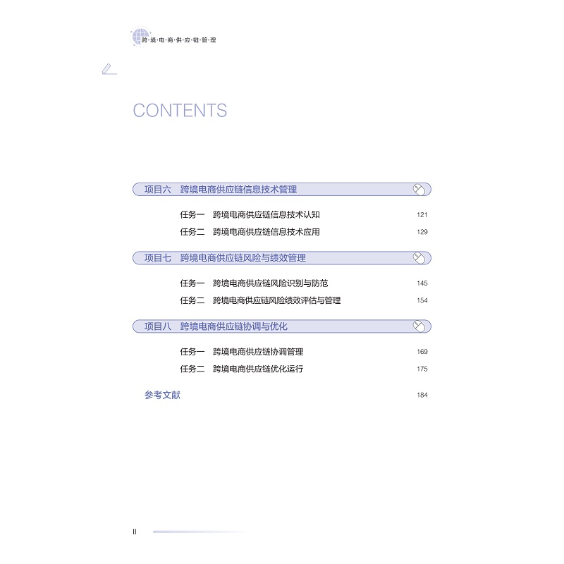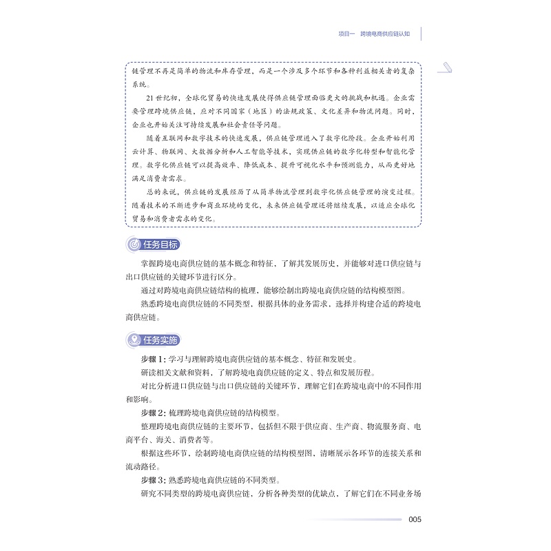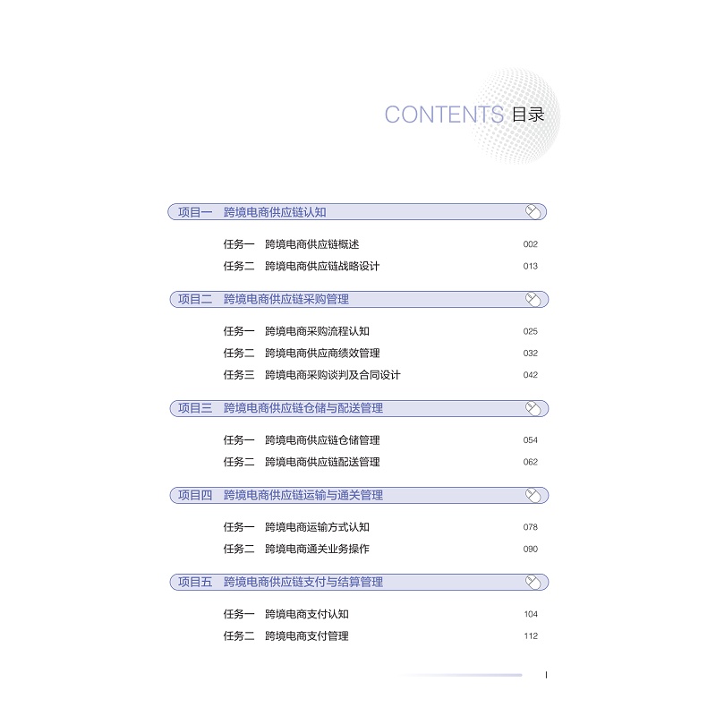 《跨境电商供应链管理》由8个学习任务(项目、任务) 构成,包括跨境电商供应链管理认知、跨境电商供应链采购管理、跨境电商供应链仓储与配送管理、跨境电商供应链运输与通关管理、跨境电商供应链支付、跨境电商供应链信息与技术管理、跨境电商供应链风险与绩效管理、跨境电商供应链协调与优化。通过本教材的学习,使学生掌握跨境电商供应链的基本知识,初步认知工作岗位并具有较好的职业素质,系统了解跨境电商供应链的全流程设计,培养学生运用跨境供应链理念分析和解决问题的能力、团结协作的职业品质、爱岗敬业的劳动态度和精益求精的工匠精神,为今后从事跨境电商供应链管理岗位工作和其他跨境电商岗位工作奠定扎实基础。
