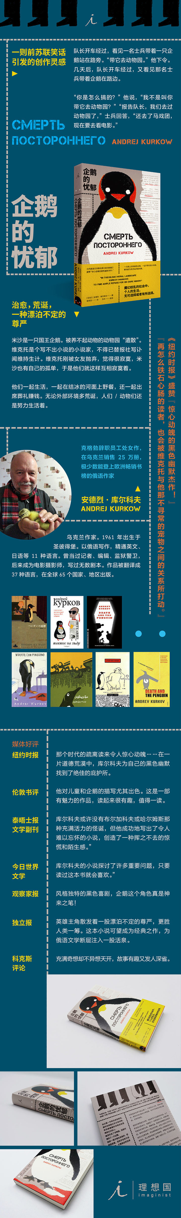 安德烈•库尔科夫(Andrej Kurkow),1961年出生于圣彼得堡,幼年时迁居基辅。从六岁就开始提笔创作,嗜好是收集仙人掌。基辅大学就学期间主修外语,以俄语写作,并精通英文、日语等十一种语言。曾当过记者、编辑、监狱警卫,后来成为电影摄影师,写过无数剧本,第一部小说获得俄罗斯书卷奖,作品被翻译成三十七种语言,在全球六十五个国家、地区出版。现定居基辅。