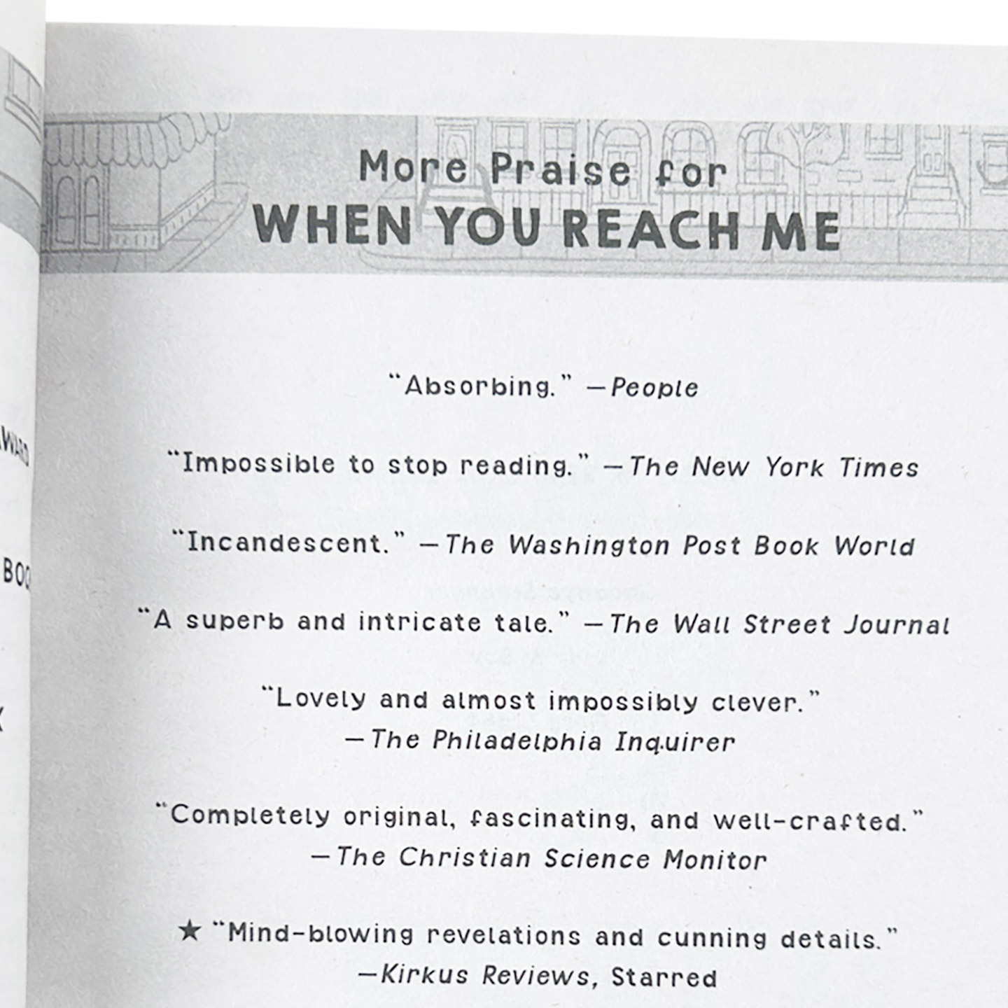 When You Reach Me《当你到达我》是美国畅销儿童文学作家丽贝卡·斯戴德的原创小说,荣获2010年美国纽伯瑞儿童文学奖金奖。