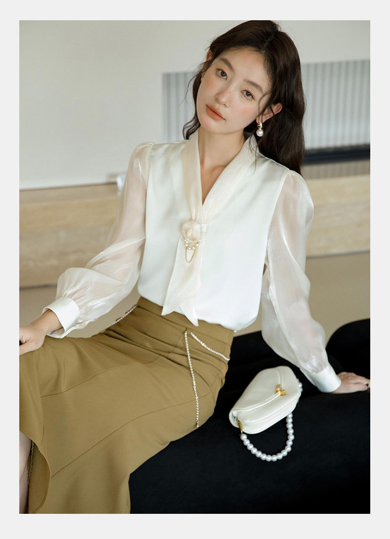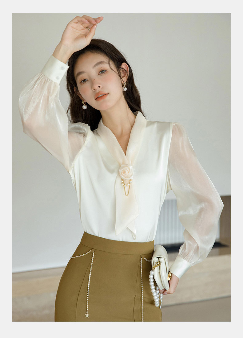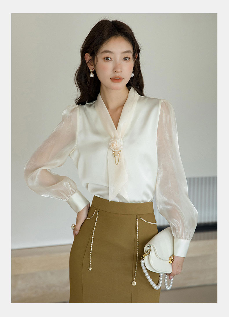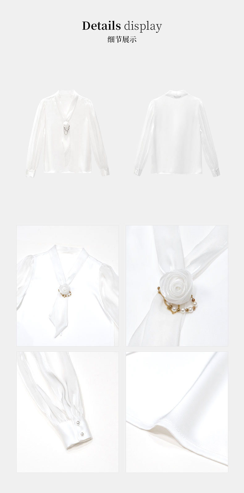 【铂金会员165/天猫229/差价64】(13111)2023新款春秋白色珠光缎面V领长袖气质漂亮职业雪纺衫上衣女衬衫