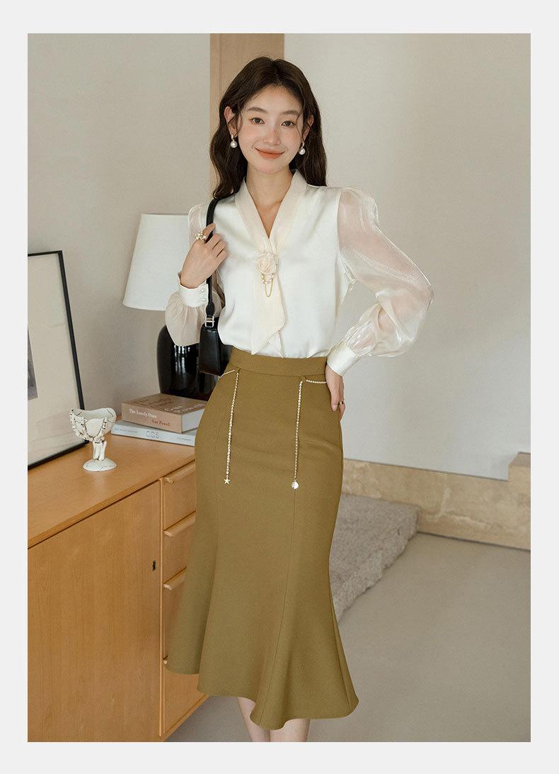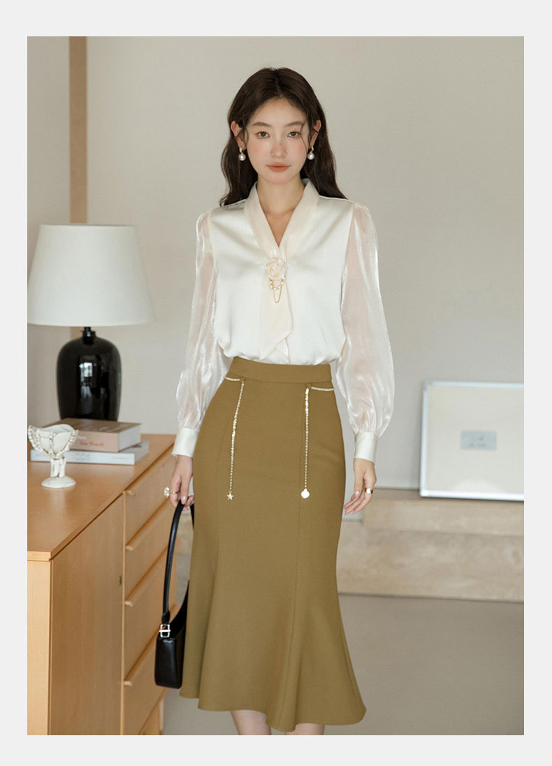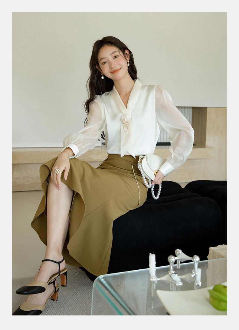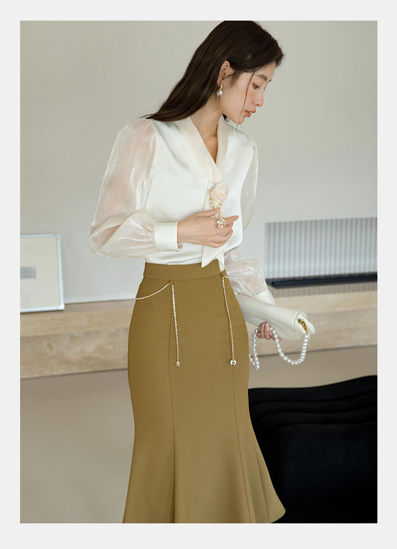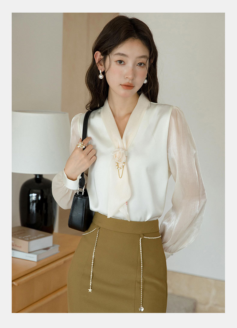 【铂金会员165/天猫229/差价64】(13111)2023新款春秋白色珠光缎面V领长袖气质漂亮职业雪纺衫上衣女衬衫
