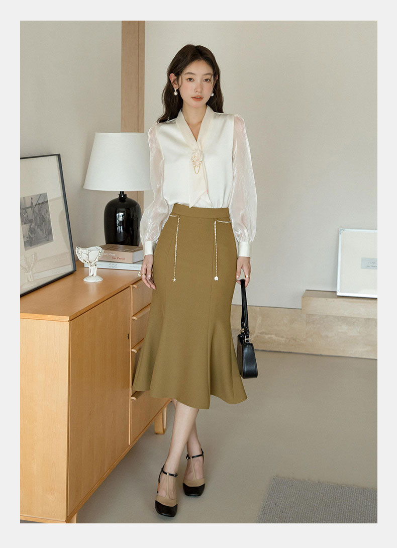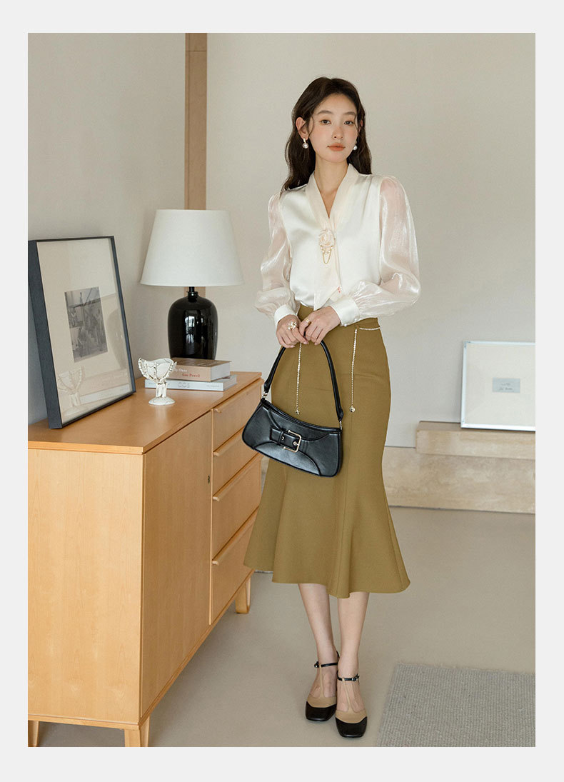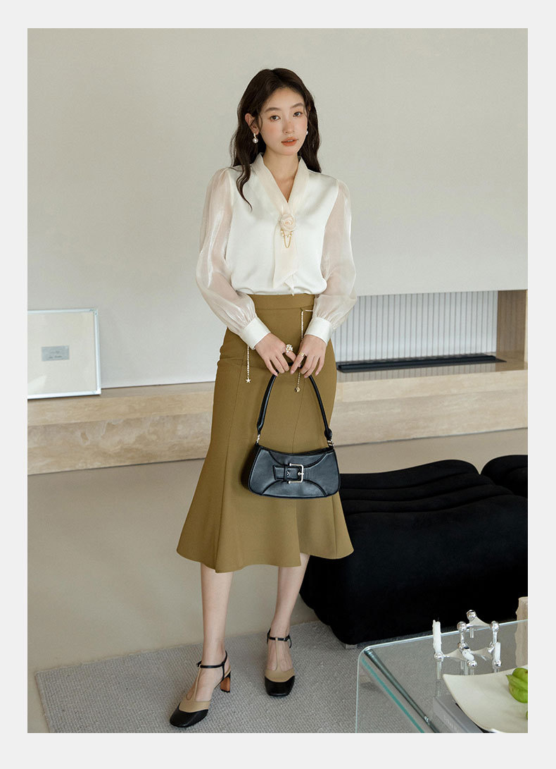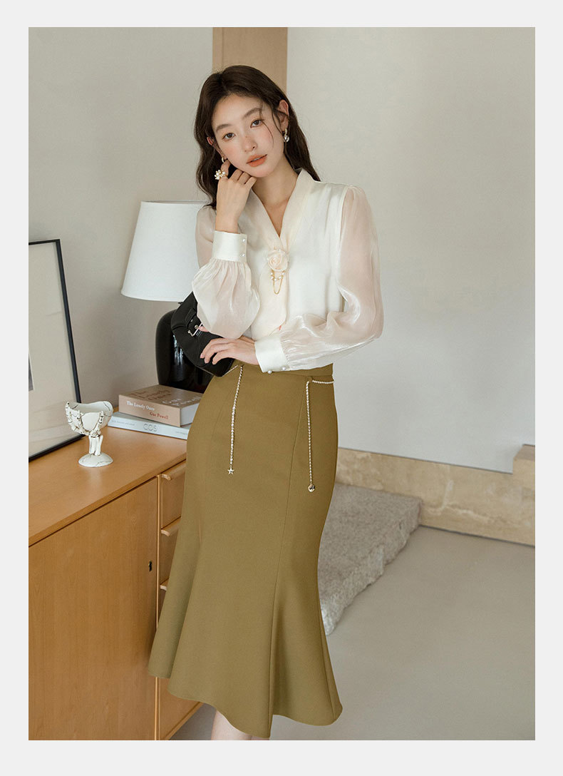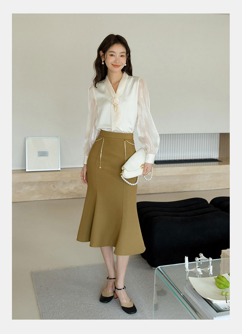 【铂金会员165/天猫229/差价64】(13111)2023新款春秋白色珠光缎面V领长袖气质漂亮职业雪纺衫上衣女衬衫