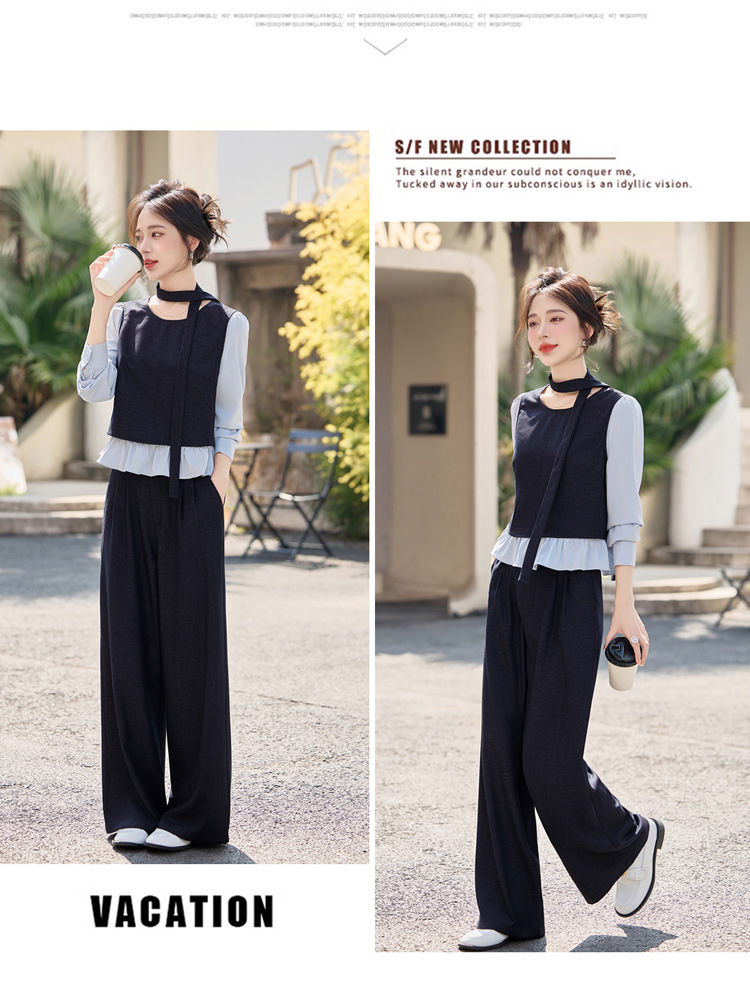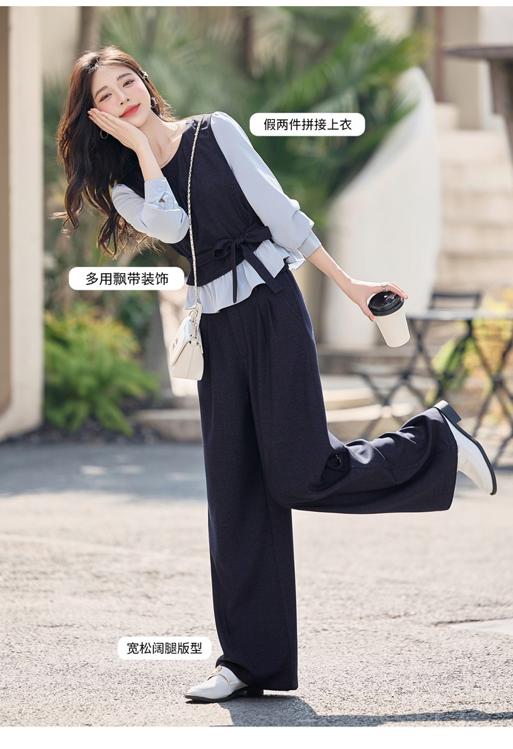 KX8505套装女2025秋季新款女装飘带拼接洋气衬衫阔腿裤两件套