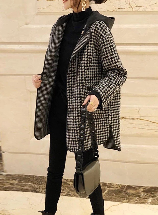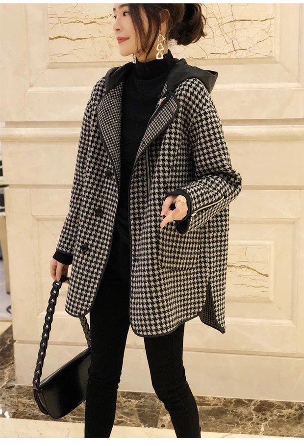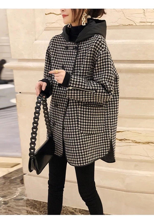 雀说 外套女早春格子宽松连帽显瘦毛呢大衣4ZF-022605