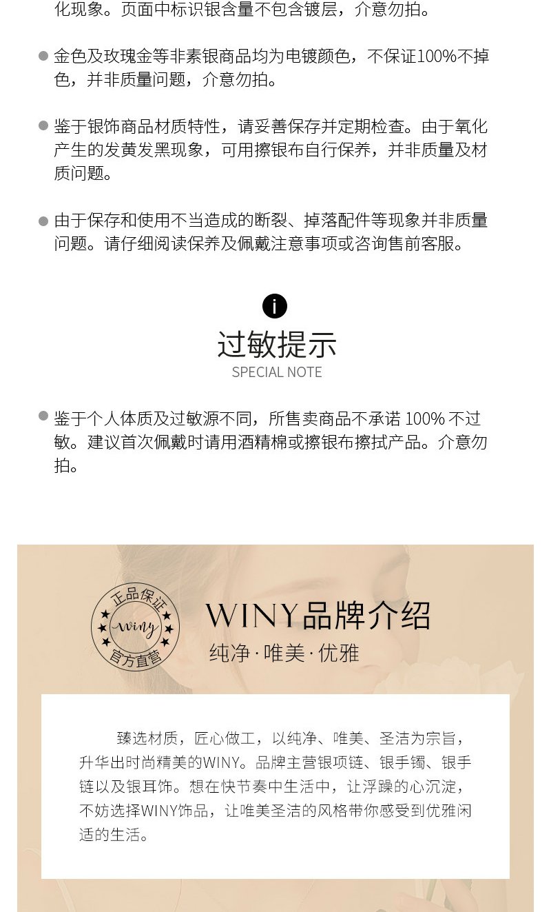 唯一winy是国内网络饰品品牌的先行者。 创立初衷源于对亲情、爱情、友情的珍惜唯一,用心做好每一件饰品为您守护人生中如珠宝般珍贵动人的那些时刻那怕岁月流转,唯爱始终如一。