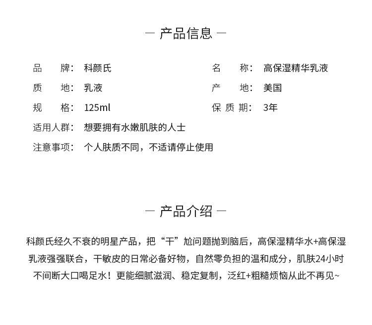 【保税直邮 长沙海关】科颜氏高保湿乳液125ml
