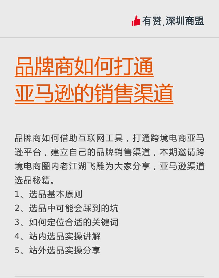 【深圳商盟】运营分享会 | 品牌商如何打通 亚马逊的销售渠道 商品图0