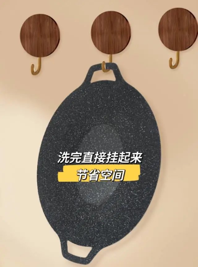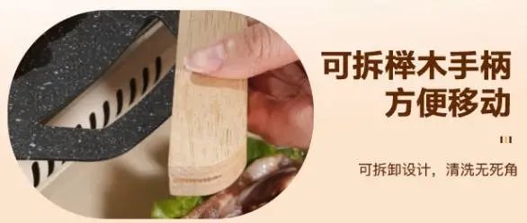 可拆卸防烫木柄,两手端拿更安排,拆卸清洗更方便。麦饭石不粘锅,一擦即净,户外也能轻松清洗。洗完往墙上一挂,节省空间易收纳。