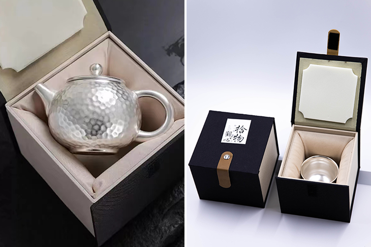 除此之外,掌柜还带来锤纹鎏银古法瓷胎罗汉杯,和西施壶配一席用,邀三两知己举杯赏月,至有诗意。