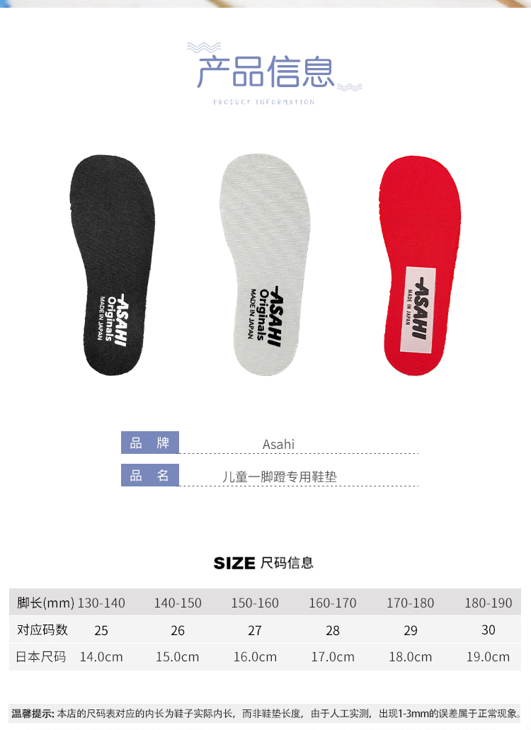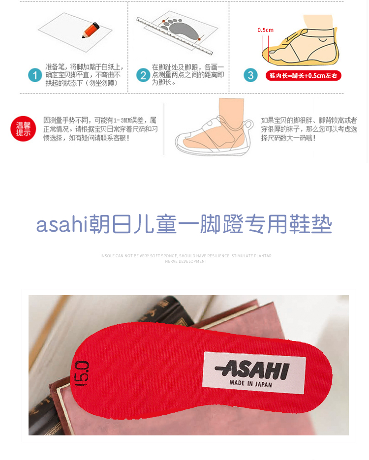 asahi朝日一脚蹬专用鞋垫小孩鞋垫男童女童