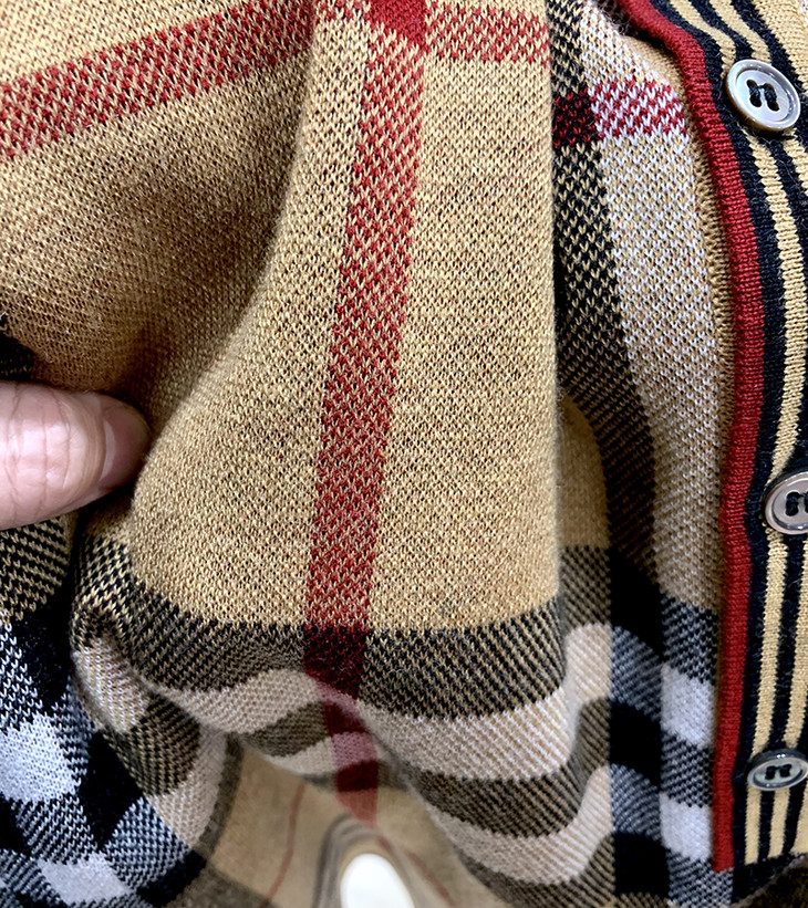 毛衣的反面是芝麻底织4色双面芝麻点提花,而且是对色对条的剪裁,不管是工艺,还是面料的损耗,都是相当的惊人滴。