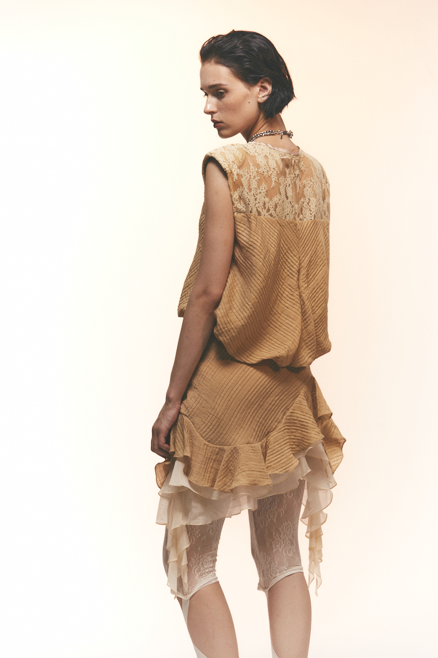 这款短上衣有着独特的小宽肩结构,柔化肩线同时带出一种静逸的存在感。肩部拼接细腻蕾丝,轻柔却有分量。