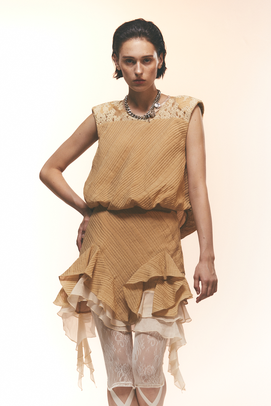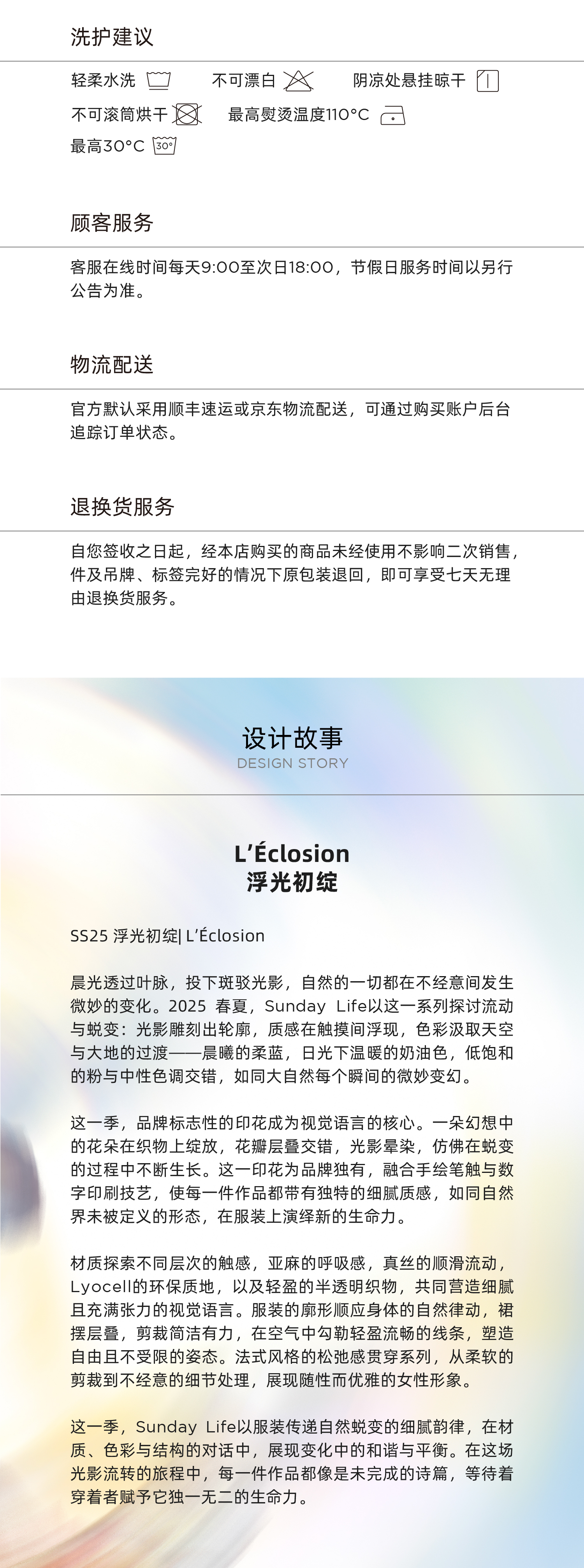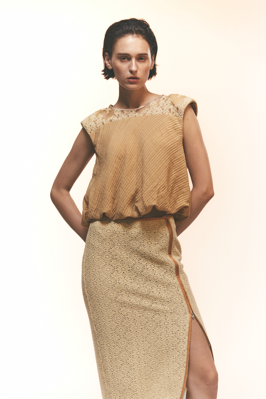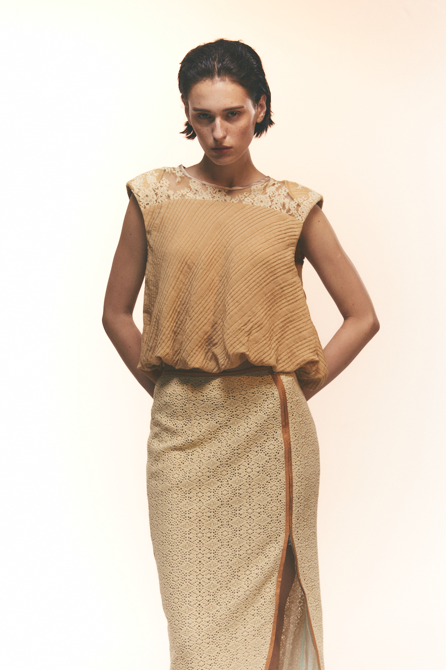 哑光表面与隐约肌理交叠,让人联想到老照片中褪色的质地,安静而富有故事感。无论是搭配阔腿裤、短裙,或复古牛仔裤,都能呈现出松弛的复古感。面料轻薄柔软,并有一种蓬松感。