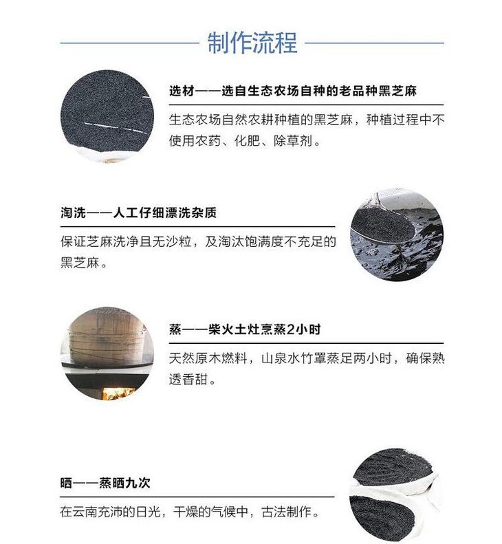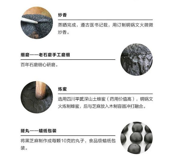 【生产标准】主原料使用多年自然农耕土地出产的黑芝麻,种植全程没有使用过任何化学品;辅料使用深山土蜂蜜,环境纯净没有污染;严格遵循古法,九蒸九晒,使用特制铜锅文火炒香,祖传石磨手工研磨;使用特制铜锅炼蜜,然后将研磨好的黑芝麻糊和炼好的蜜置于特制木箱内进行300次冲捣融合,最后手工搓丸,用食品级蜡纸包好,装瓶封瓶。