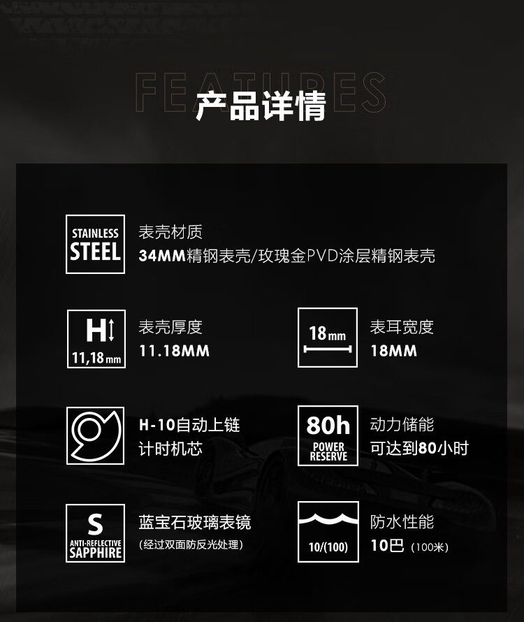 | 机芯 | 自动机械 H-10 80小时动力储备 | 表径 | 34 mm |