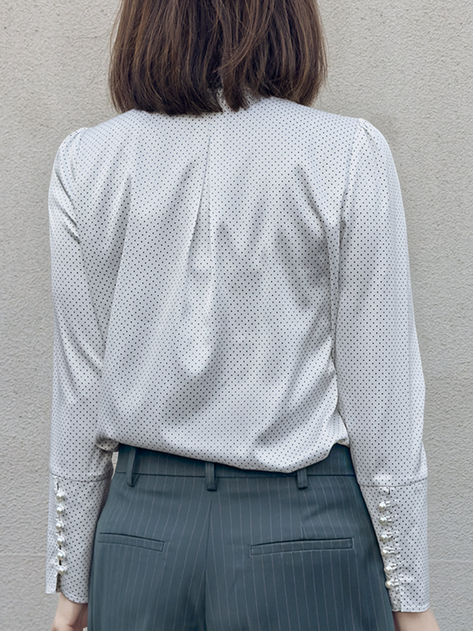 TYNVIE 不对称蕾丝领口长袖衬衫-白底黑点