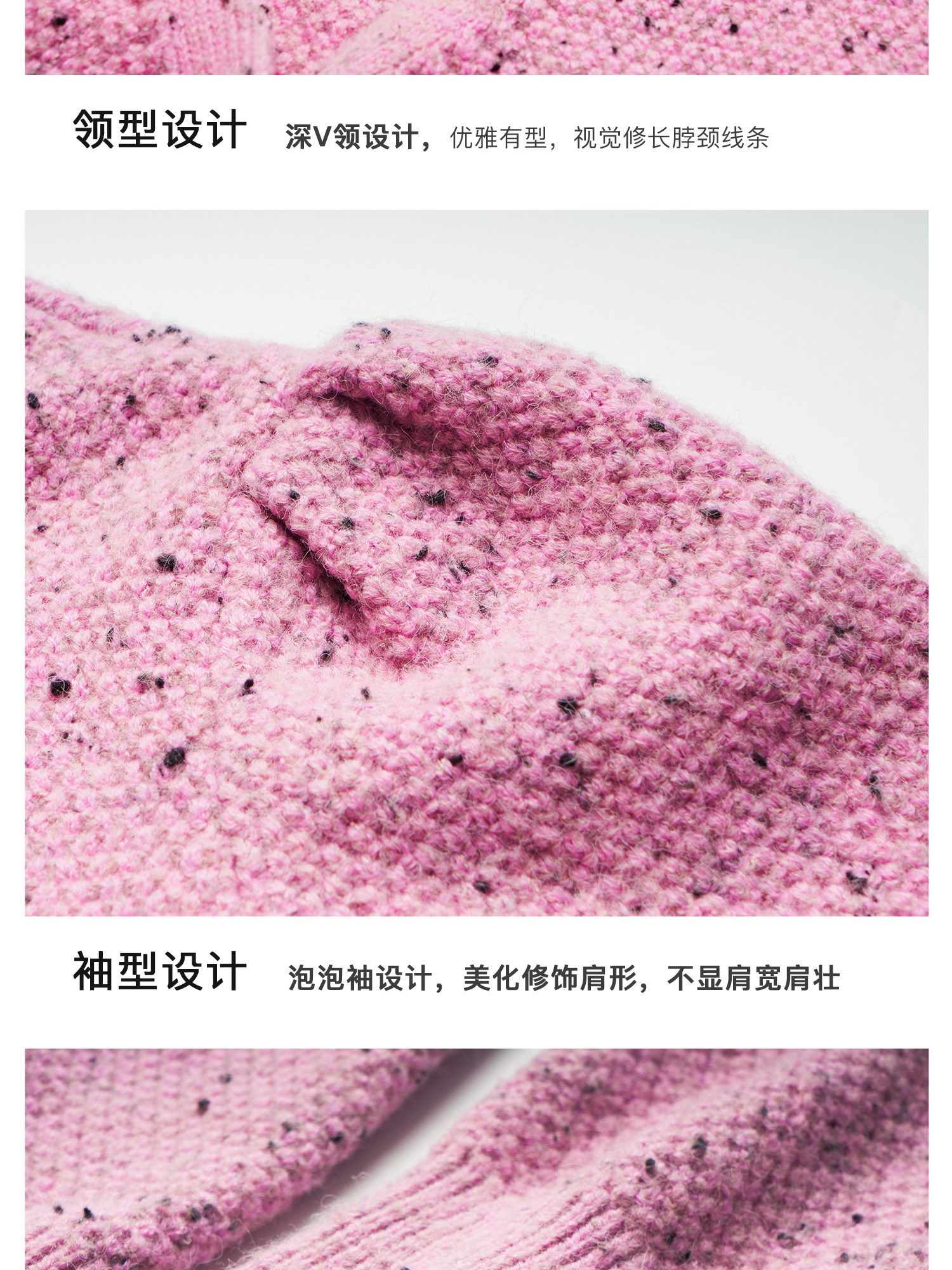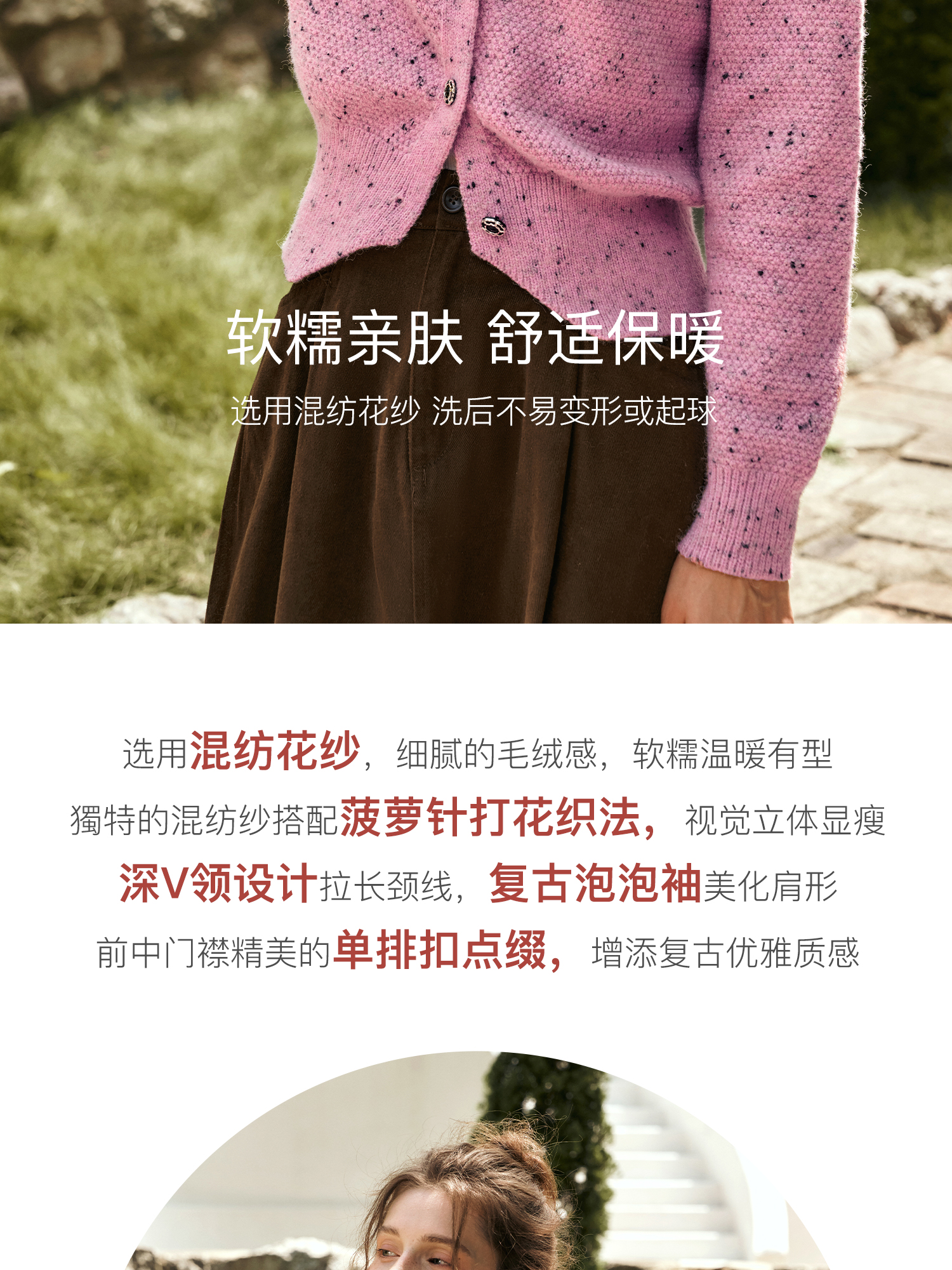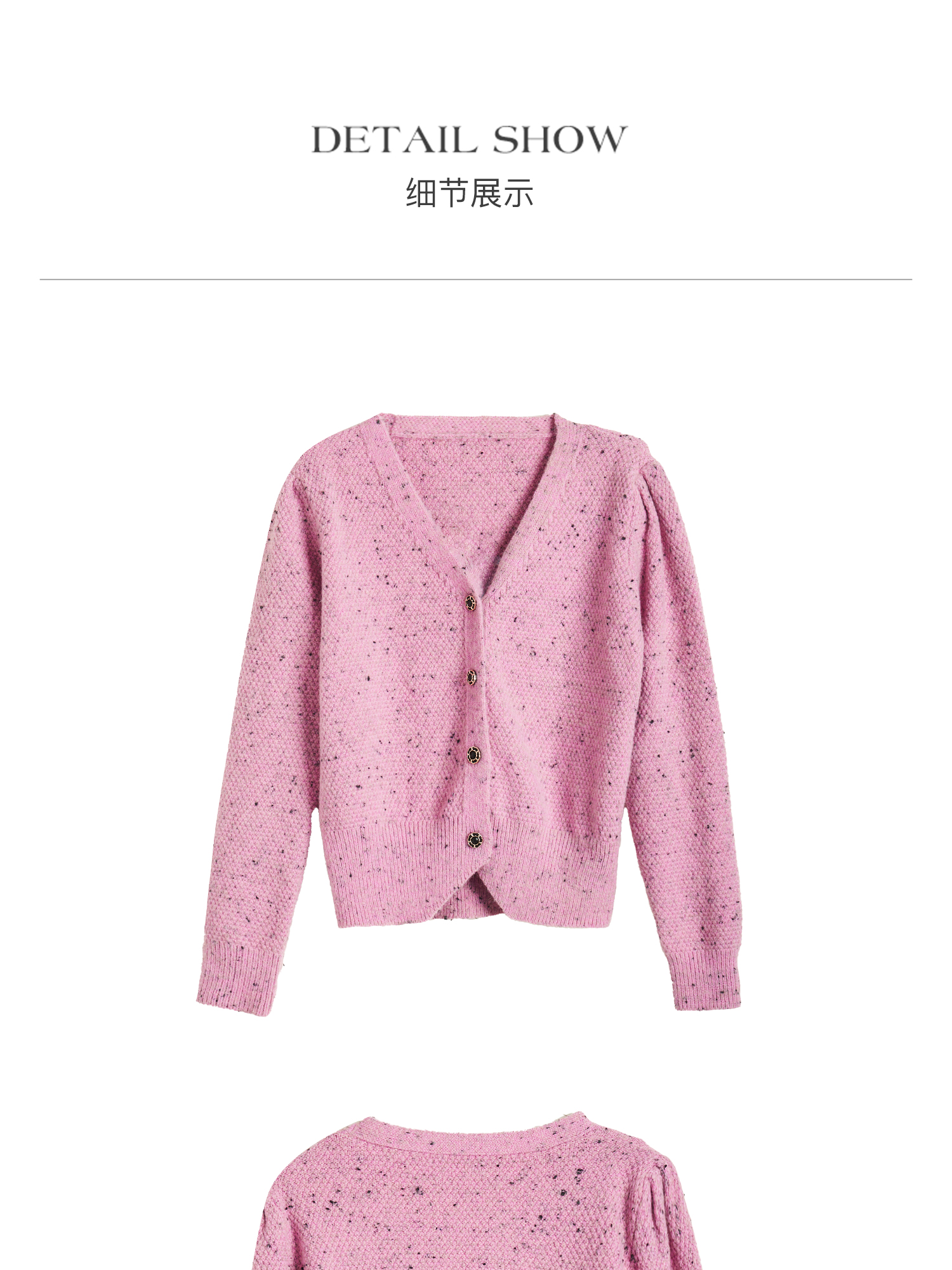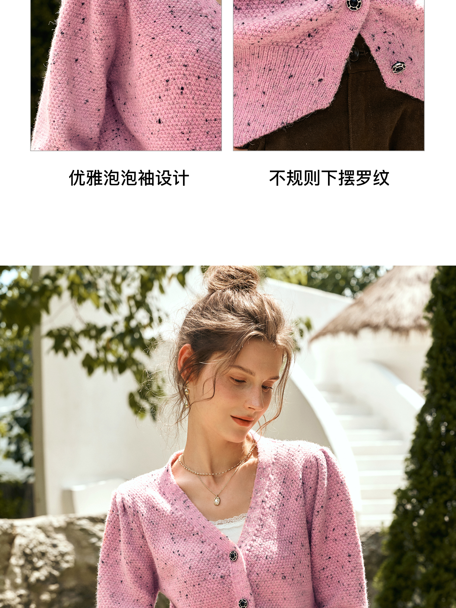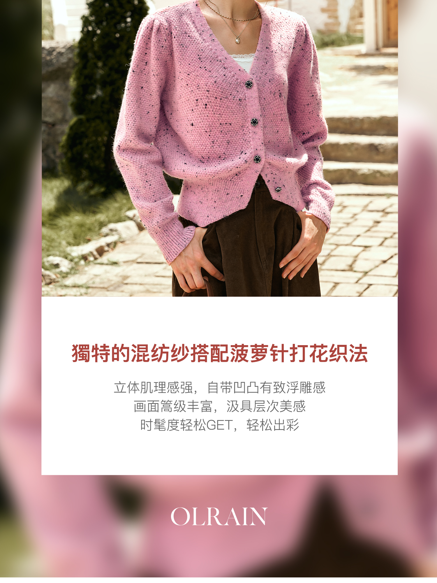 OLrain欧芮儿粉色毛衣开衫女秋季2024新款法式V领泡泡袖针织上衣