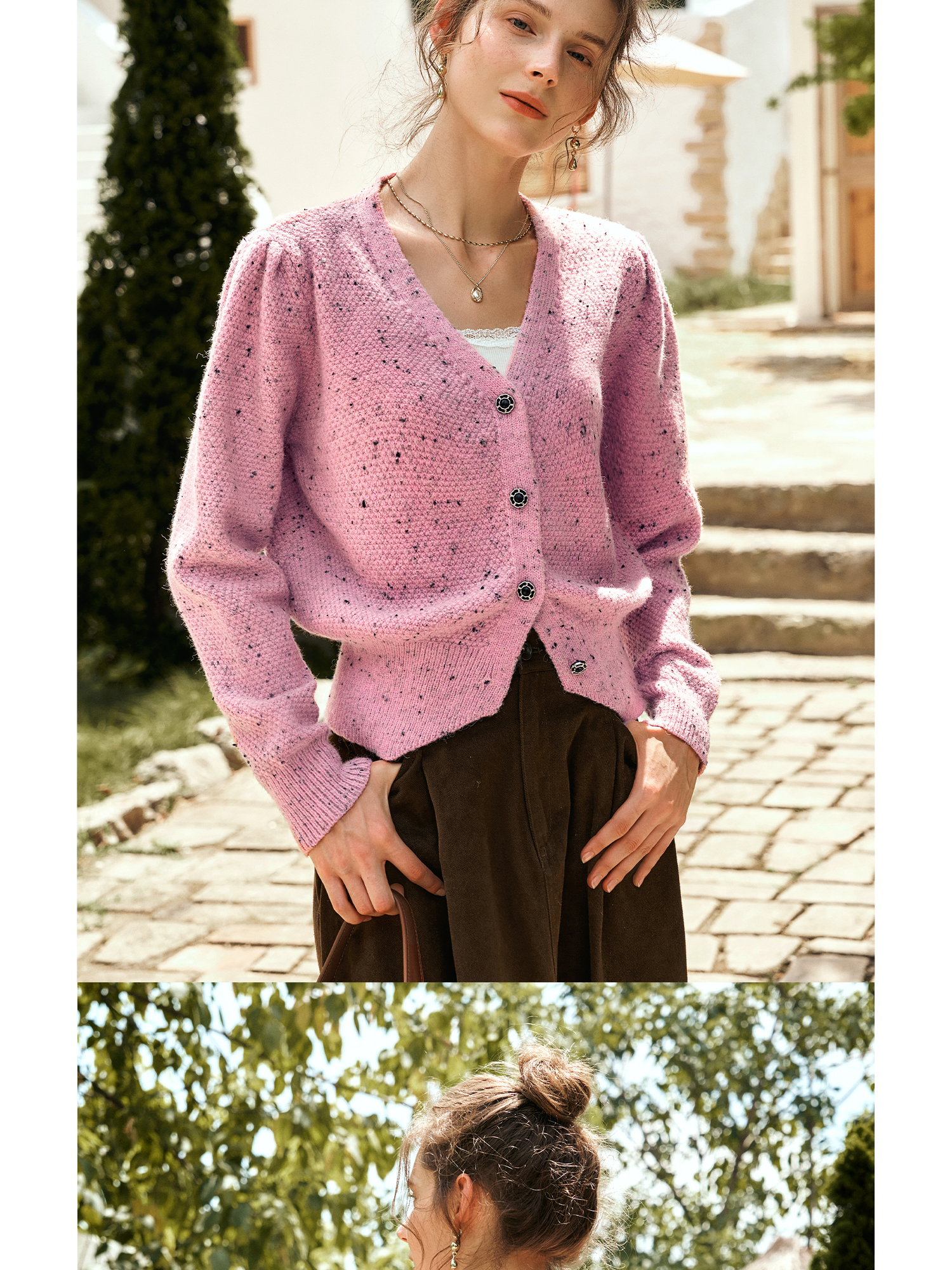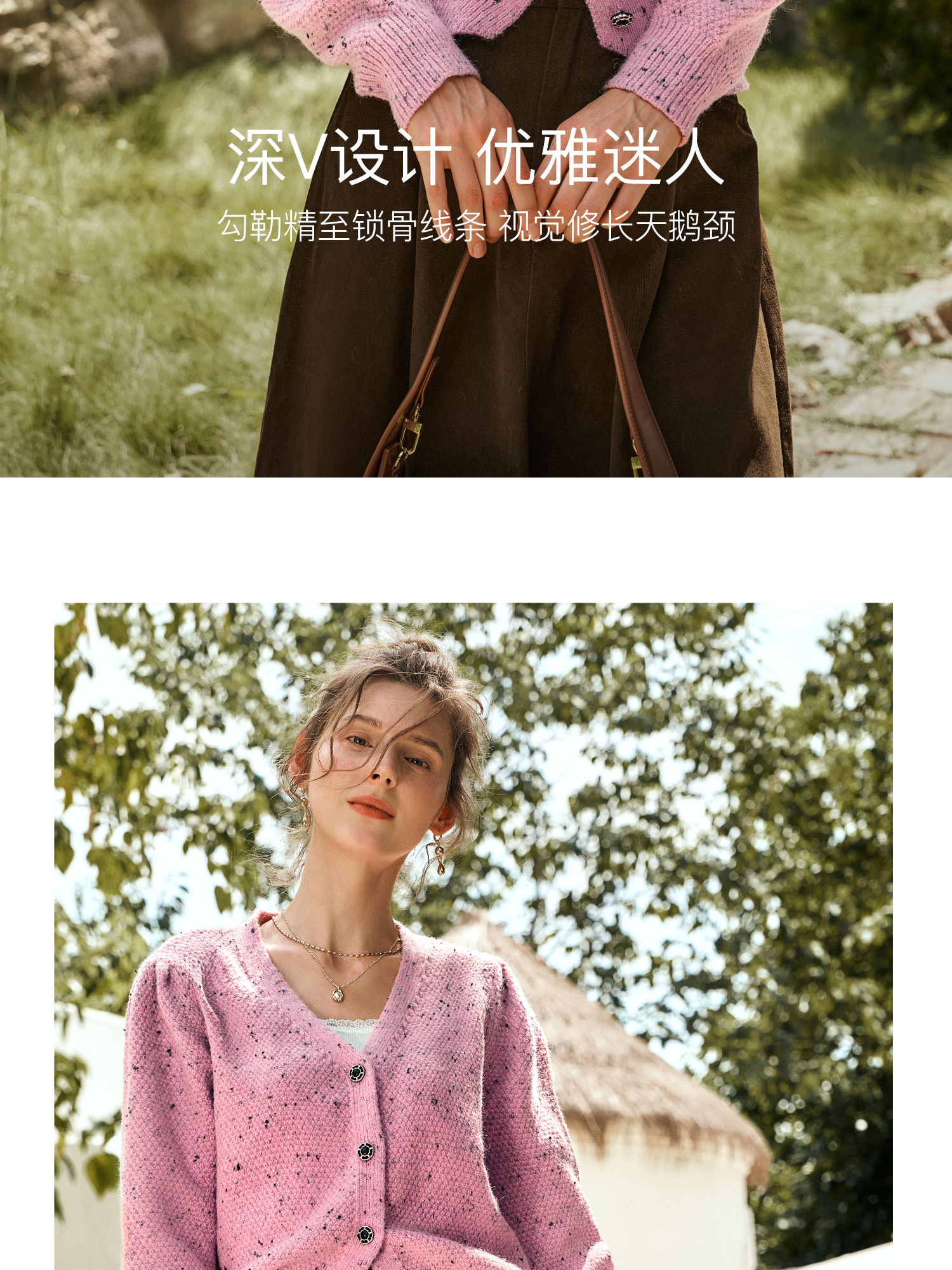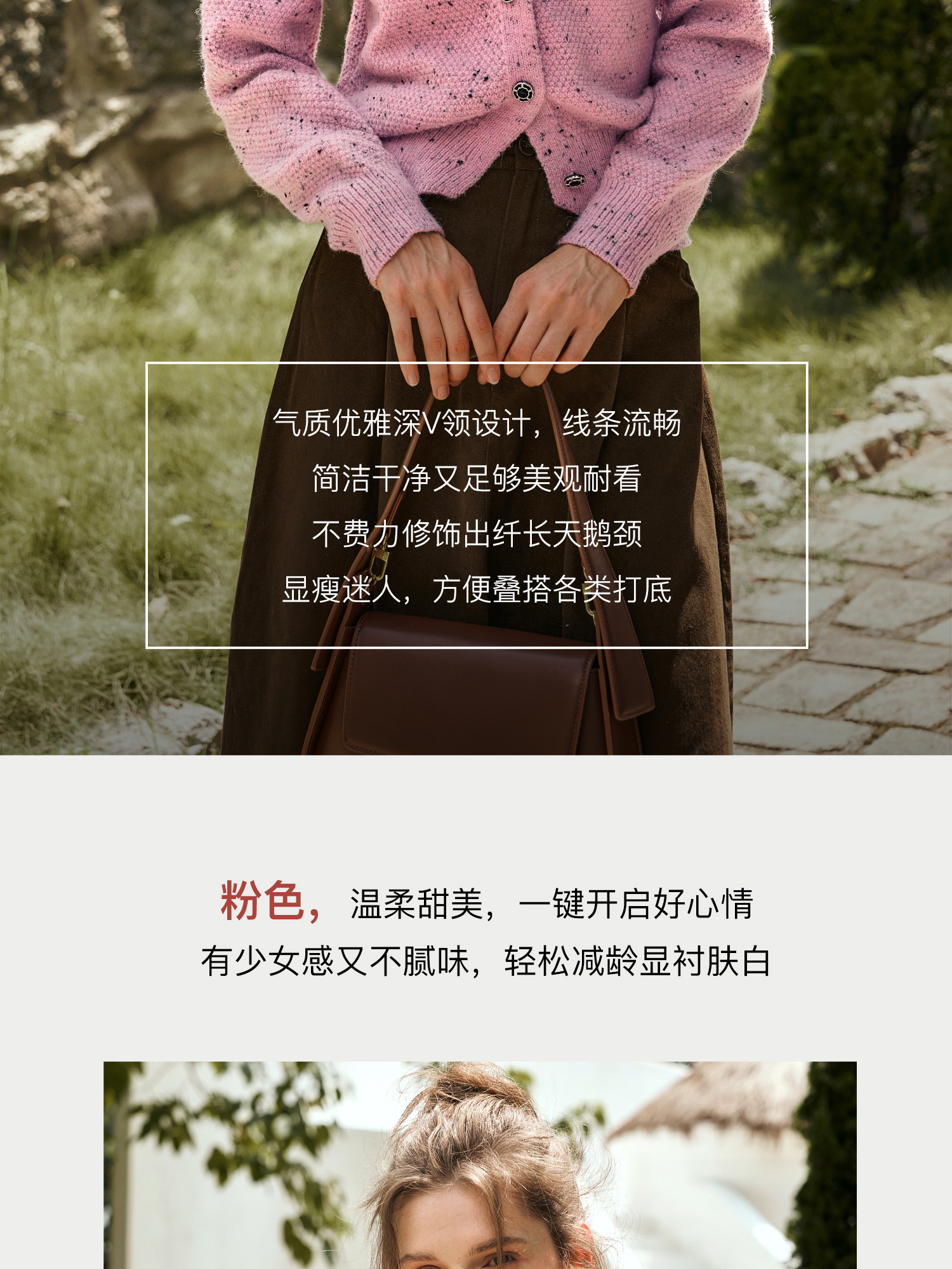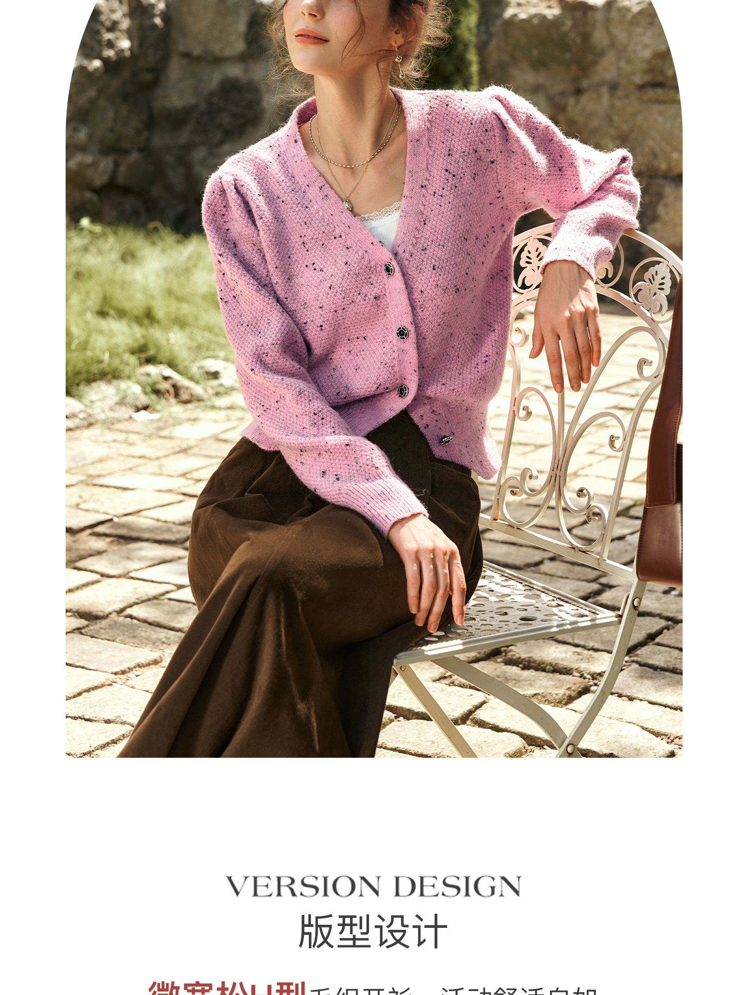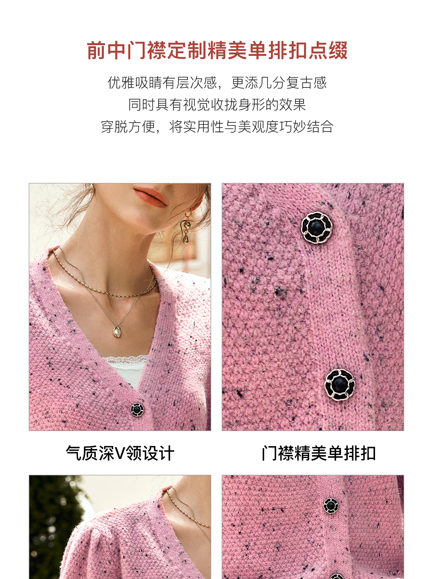 OLrain欧芮儿粉色毛衣开衫女秋季2024新款法式V领泡泡袖针织上衣