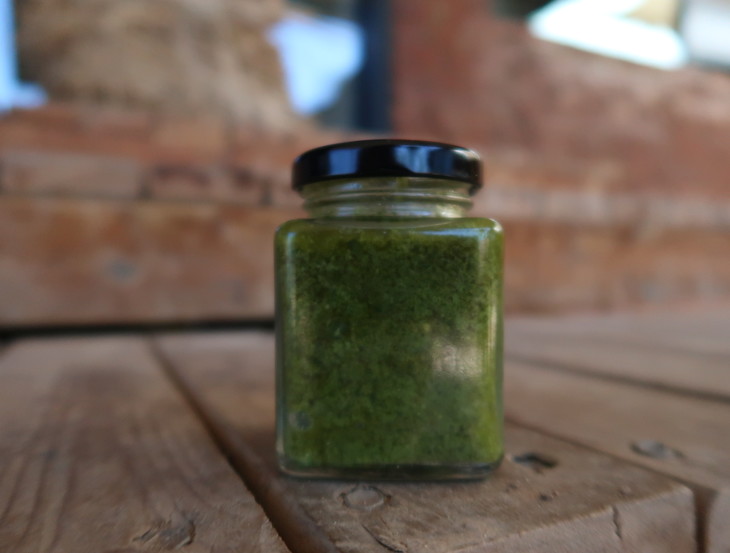 我们的罗勒酱制作方式:全部罗勒叶取用叶片,佐以东北野生松子、帕玛森奶酪、地里的大蒜,加入橄榄油,全部捣碎混合,鲜亮的绿色被完好地保存在咸香的酱里。